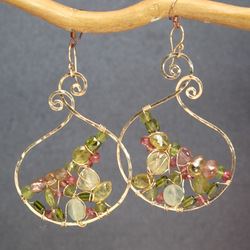 Metal: GoldLarge hammered swirl drops wrapped with peridot, prehnite, and tourmaline inside, about 2" long.Available in either 14K gold fill or sterling silver. All jewelry is entirely handmade in our studio in New York.