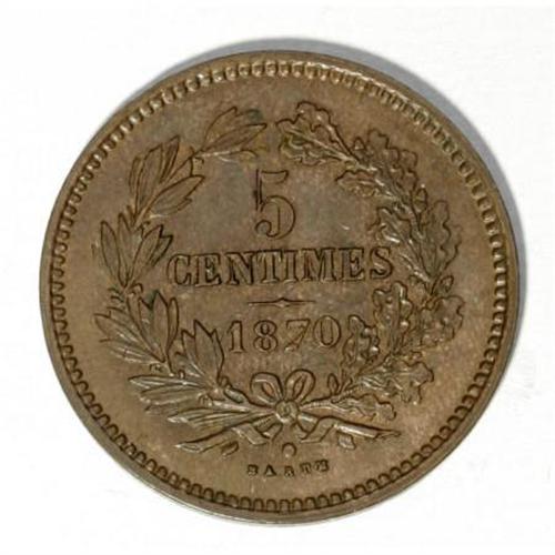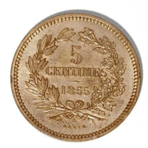 <B>A 3-piece lot of 5 Centimes as follows:</B></I> 1854 (U), KM22.1, Red and Brown UNC; 1855 (A), KM22.2, AU details, cleaned; and an 1870 (U), KM22.1, Brown UNC. <B>Sold as is, no return lot.</B></I><BR><I>From the Robert Sayre Collection.</B></I><BR><BR><b>Shipping:</b> Coins & Currency (<a target="_blank" href="http://www.heritageauctions.com/common/shipping.php">view shipping information</a>)