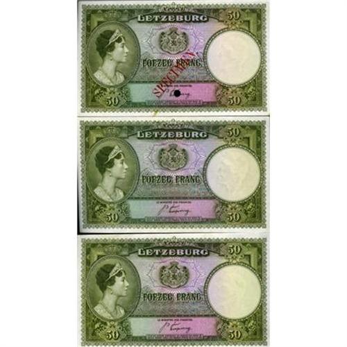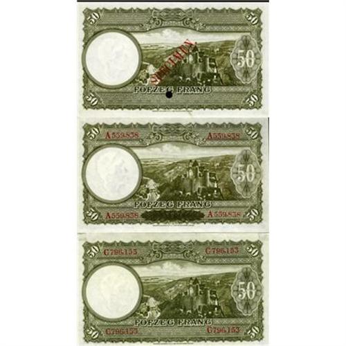 <B>Allied Occupation 50 Francs (1944) - Trio,</B></I> Pick 45, Series A AU-UNC, Pick 46, Series C AU-UNC, and Pick 46s, Specimen with red overprint, UNC with light paper clip mark on the upper margin and a tiny stain on the lower front margin.<BR><I>From the Robert Sayre Collection.</B></I><BR><BR><b>Shipping:</b> Coins & Currency (<a target="_blank" href="http://www.heritageauctions.com/common/shipping.php">view shipping information</a>)