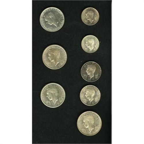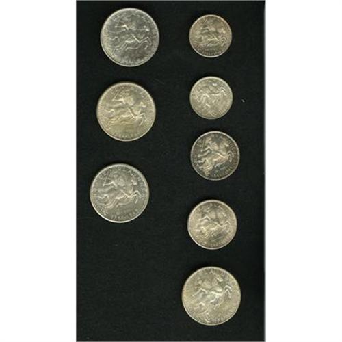 <B>Eight-piece group of 1946 silver as follows:</B></I> (1) each original 20 and 50 Francs and (2) 100 Francs; and (1) each restrike 20 and 50 Francs and (2) 100 Francs. all are UNC. <B>Sold as is, no return lot.</B></I><BR><I>From the Robert Sayre Collection.</B></I><BR><BR><b>Shipping:</b> Coins & Currency (<a target="_blank" href="http://www.heritageauctions.com/common/shipping.php">view shipping information</a>)
