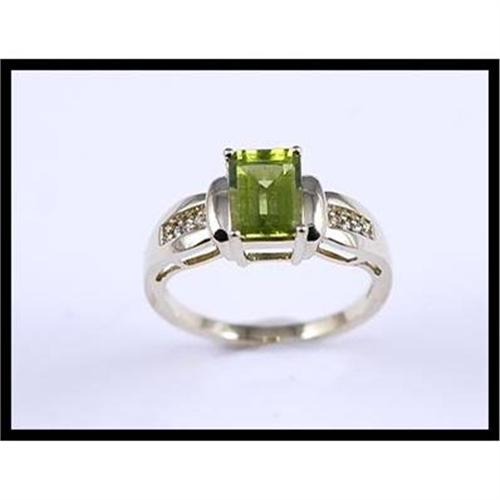 Luxuriant ring with 1 baguette cut green period and 6 full cut diamonds set in 14K yellow gold. The ring measures 8.4 millimeters (0.33 inches) wide.