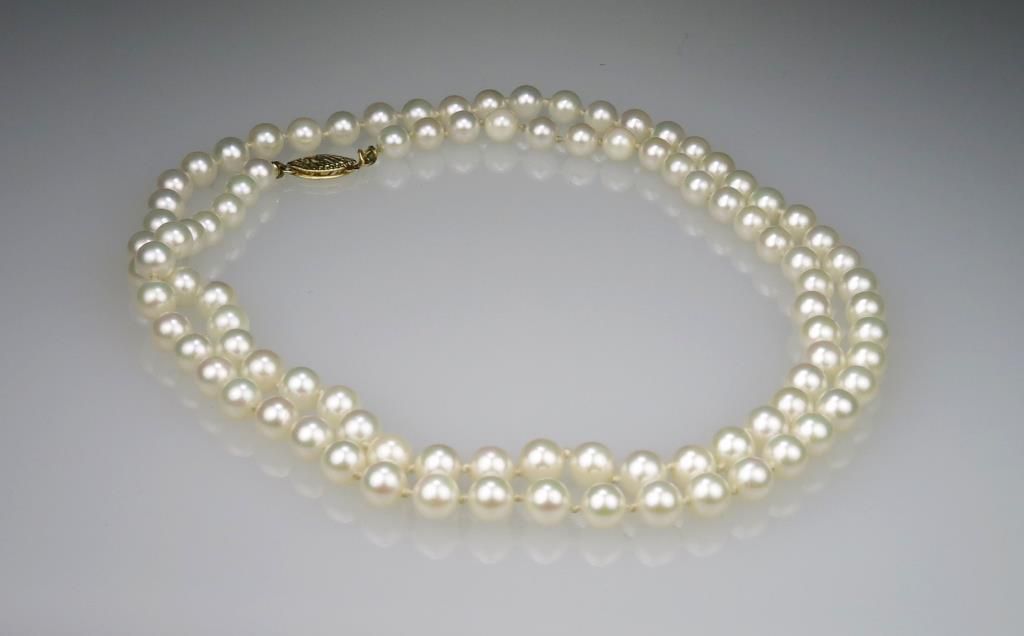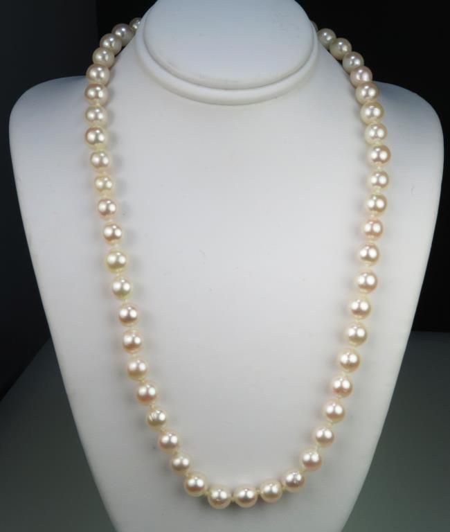 Luxurious Strand of 6.50 mm Pink Cultured Pearls rose pink color with soft luster hand knotted measuring 15” in length with 14 karat yellow gold filigree clasp. Retail $900-$1,200 Estimate $400-$600