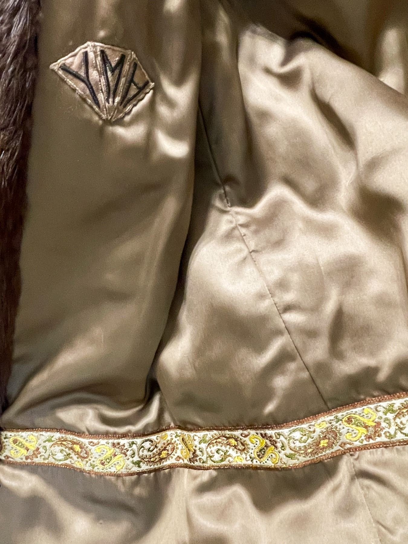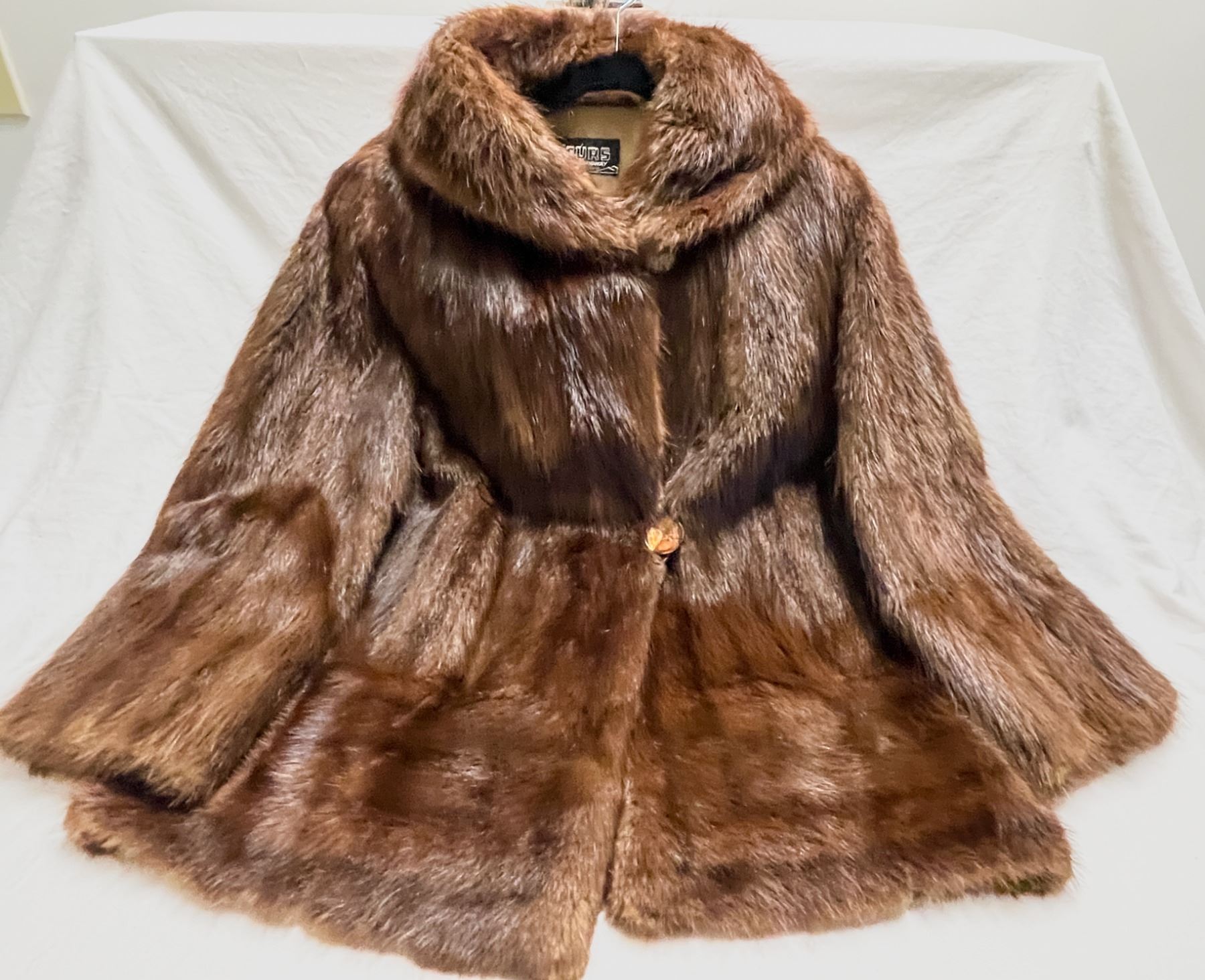 Exquisite vintage mink fur coat by Karoway Furs Ltd., crafted in Canada. This stunning piece features soft, glossy mahogany-brown mink with a subtle natural sheen and full, flowing drape. The design includes a rounded shawl collar, a single statement button closure, and a smooth satin lining. Fits approximately a size large. In excellent vintage condition, with supple pelts and no shedding — a timeless, elegant piece from one of Canada’s respected mid-century furriers.