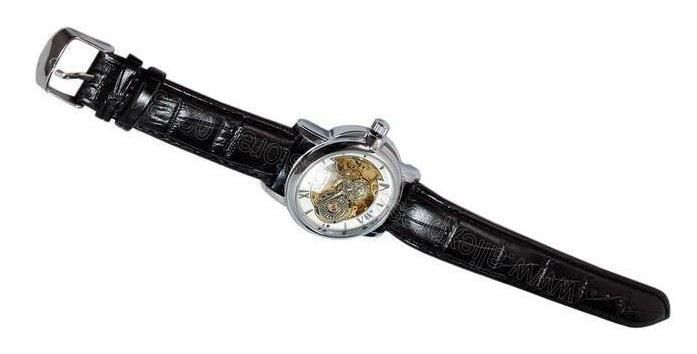 Luxury Golden & White Skeleton Dial Men's Mechanical And Wind Wrist Watch. Black Roman Numerals Are Set On A White Back Ground. The Band Is Black Leather. Watch Works Can Be Seen From The Back And Front.