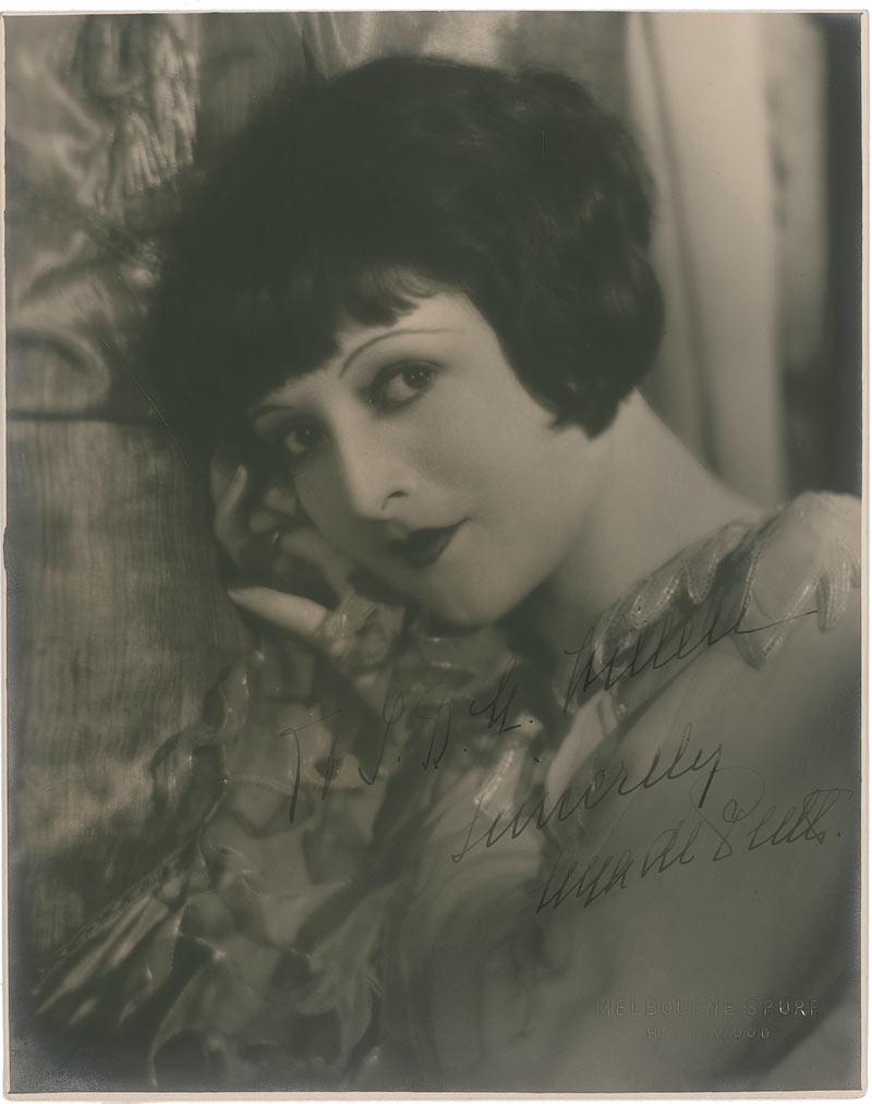Hungarian film actress (1899-1931) of the silent film era, noted for her portrayal of vamp characters. Vintage matte-finish 7.75 x 9.75 Melbourne Spurr photo, signed and inscribed in fountain pen “To J. B. M. Killen, Sincerely, Lya de Putti.” Lightly trimmed edges, scattered light edge silvering, and some light contrast to inscription, otherwise fine condition.