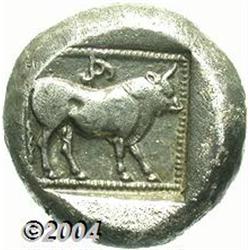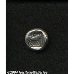 <B>Lycian Dynasts. Kuprlli.</B></I> Ca. 470-440 B.C. AR stater (18 mm, 8.85 g). Lion attacking bull standing left / Bull standing right within dotted square border. O. Morkholm and J. Zahle, "The coinage of Kuprlli. Numismatic and Archaeological study," <I>AA</B></I> XLIII (1972), -; Reuter -. Toned VF. <BR><BR><B>Important notice:</B> Heritage usually auctions material at the rate of 200-250 lots per hour. On some occasions eBay Live bid software or the Internet may not be able to keep up with the pace of the auction. We recommend placing a realistic absentee bid now as insurance to avoid disappointment. Occasionally the auctioneer may eliminate or reject an eBay Live bid, and the auctioneer may also reopen a lot after the close of the eBay live bidding (usually because we missed an audience bid), and may reject your bid even if it shows you as the winning bidder. By bidding via eBay Live, you agree that Heritage may award the lot to another bidder at its sole discretion under the circumstances described above or any other reasonable circumstances. Since eBay bids are not shown to us until we open the lot on the floor, we treat those bids just like floor bids. In most cases the floor responds before the eBay bid is presented to us, due to Internet lag time, so for consistency we have made it a policy that floor bids are always considered first over tie eBay live bids. Also please note that all Heritage lots purchased through eBay Live carry a 20% Buyer's Premium. Please make sure you read the Terms and Conditions before you bid.