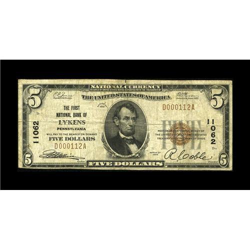 <B>Lykens, PA</B></I> - $5 1929 Ty. 1 <B>The First NB</B></I> Ch. # 11062<BR>A scarce note from the only bank to issue from this locale. <B>Fine,</B></I> and problem free for the grade.<BR><BR><b>Shipping:</b> Coin/Currency (<a target="_blank" href="http://www.heritageauctions.com/common/shipping.php">view shipping information</a>)