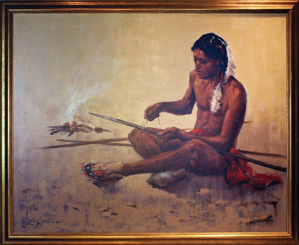 Nice oil on canvas of an Indian brave working on his spear by the campfire. Framed with image measuring 24” x 30”.