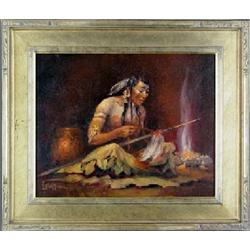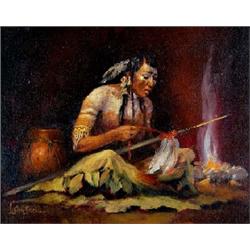 Lyle Tayson (b.1924) (Wyoming) Oil on Canvas, "Wrapping the War Lance," 16" x 20", signed lower left, Est $2,000 - $3,000