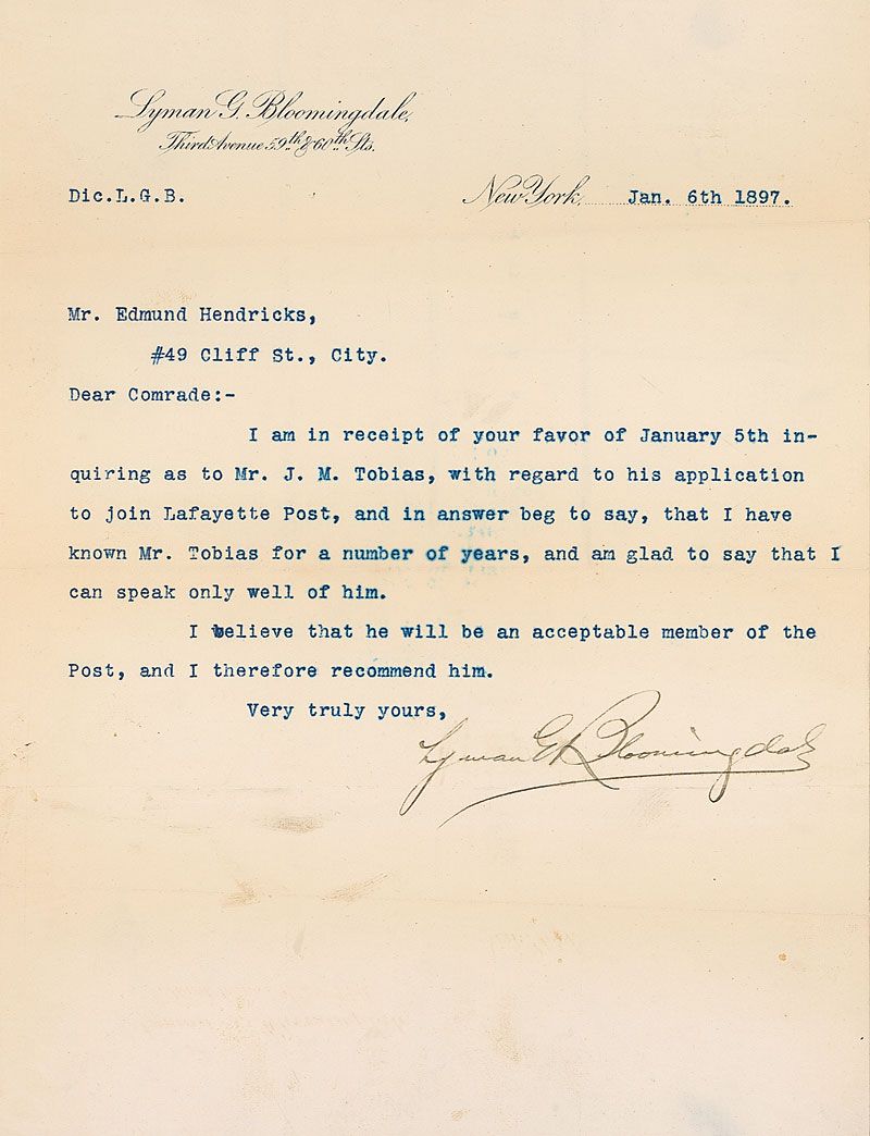 Businessman (1841–1905) who, along with his brother Joseph, founded Bloomingdale’s Department Store. TLS, signed “Lyman G. Bloomingdale,” one page, 7.25 x 9.5, personal letterhead, January 6, 1897. Letter to Edmund Hendricks. In full: “I am in receipt of your favor of January 5th inquiring as to Mr. J. M. Tobias, with regard to his application to join Lafayette Post, and in answer beg to say, that I have known Mr. Tobias for a number of years, and am glad to say that I can speak only well of him. I believe that he will be an acceptable member of the Post, and therefore recommend him.” In very good condition, with intersecting folds, a couple passing through single letters of signature and a bit of scattered light soiling. Edmund Hendricks (1834–1909), a veteran of the 7th Regiment, New York Volunteers, in the Civil War, was a member of Hendricks Brothers, a family copper business. Lafayette Post, No. 40, Grand Army of the Republic, was organized in New York City in 1880, and Hendricks was part of its Membership Committee.