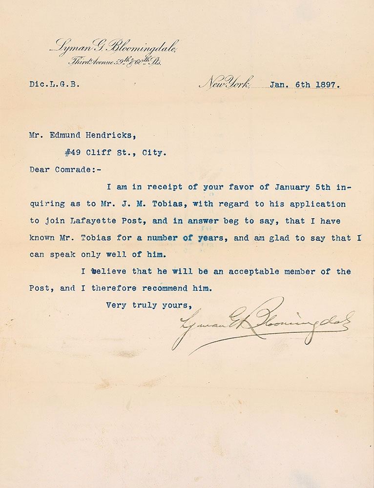 Businessman (1841–1905) who, along with his brother Joseph, founded Bloomingdale’s Department Store. TLS, signed “Lyman G. Bloomingdale,” one page, 7.25 x 9.5, personal letterhead, January 6, 1897. Letter to Edmund Hendricks, in full: “I am in receipt of your favor of January 5th inquiring as to Mr. J. M. Tobias, with regard to his application to join Lafayette Post, and in answer beg to say, that I have known Mr. Tobias for a number of years, and am glad to say that I can speak only well of him. I believe that he will be an acceptable member of the Post, and therefore recommend him.” In very good condition, with intersecting folds, a couple passing through single letters of signature and a bit of scattered light soiling. Edmund Hendricks (1834–1909), a veteran of the 7th Regiment, New York Volunteers, in the Civil War, was a member of Hendricks Brothers, a family copper business. Lafayette Post, No. 40, Grand Army of the Republic, was organized in New York City in 1880, and Hendricks was part of its Membership Committee.