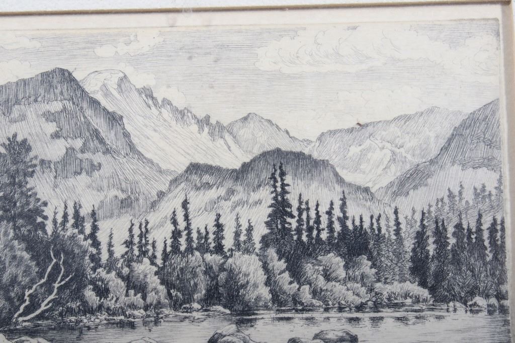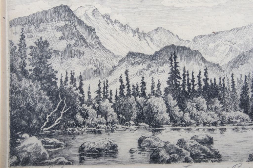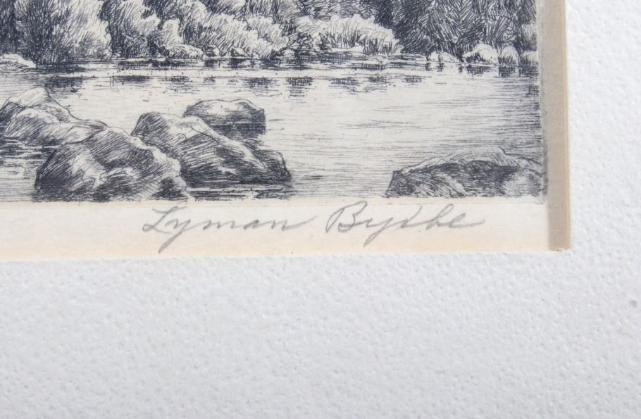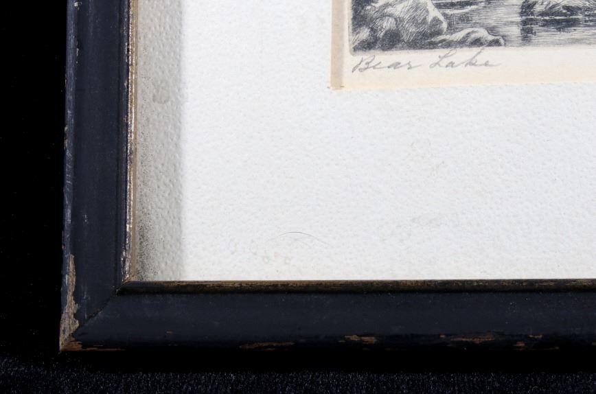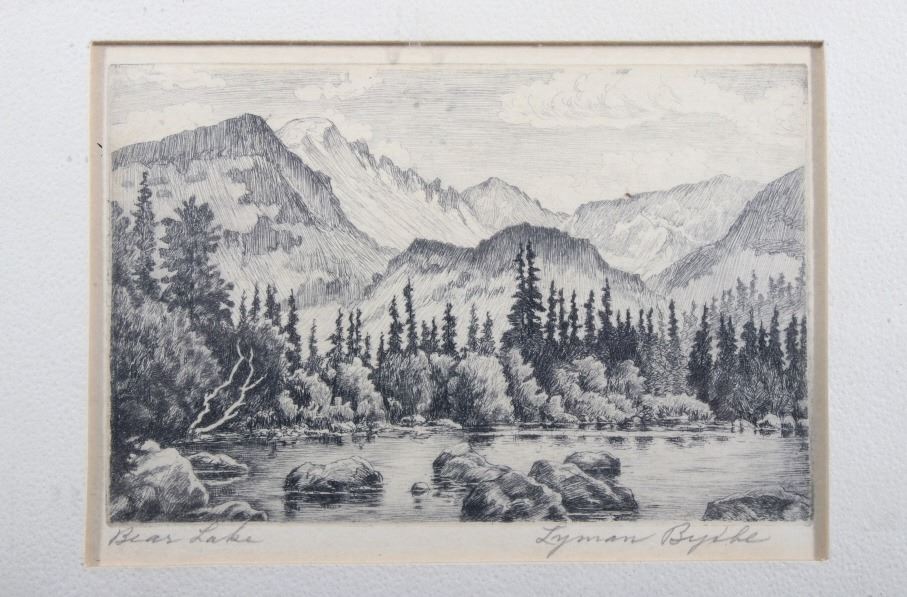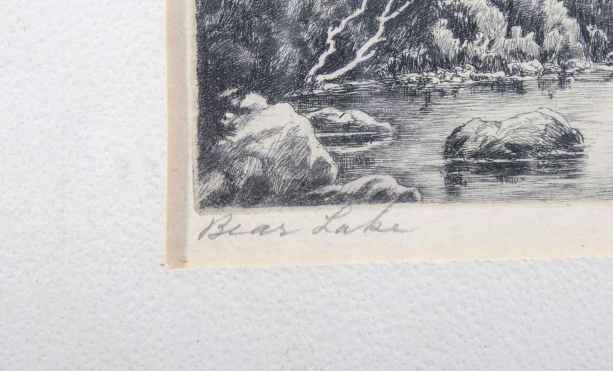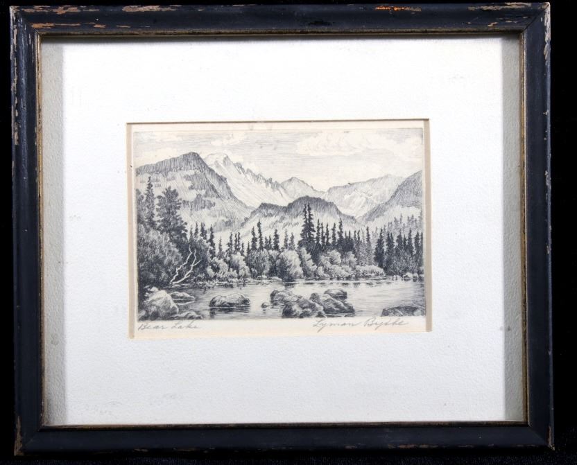 Featured in this lot we have a Lyman Byxbe etching titled 'Bear Lake' originating from circa 1948. The etching shows the surface of Bear Lake in the foreground with a number of rock protruding out of the waters surface. The background up from the lake shows reeds, bushes, and small trees shift to expanding pine forest with the Bear River Mountains set behind the trees. The piece was created by artist Lyman Byxbe an American artist known for his nature landscapes primarily of the north west United States. The etching is signed across the bottom in pencil "Bear Lake - Lyman Byxbe". The piece is in good condition overall with some wear on the frame indicative of age. The frame measures 8 3/4" wide by 7 1/4" tall.