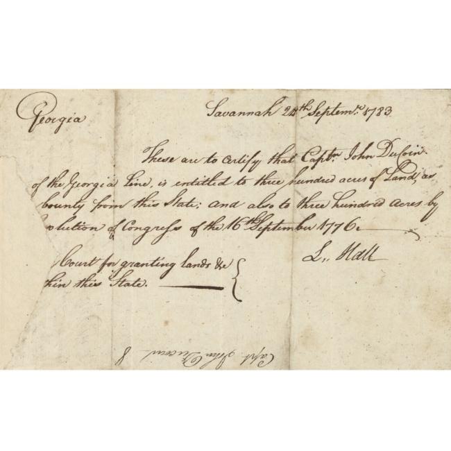 Autograph document signed by Declaration of Independence Signer Lyman Hall, one of the more scarce signers. Acting in his capacity as Governor of Georgia, Hall grants 600 acres of land to a Captain John Ducour, signing at the document's conclusion, ''L. Hall''. Datelined Savannah, 24 September 1783, half sheet measures 9'' x 5.75''. With docketing on verso. Document is inlaid and there is loss to left margin affecting three words. Housed in a blue linen folding case with a blue morocco spine lettered gilt. Attractive document in very good condition.