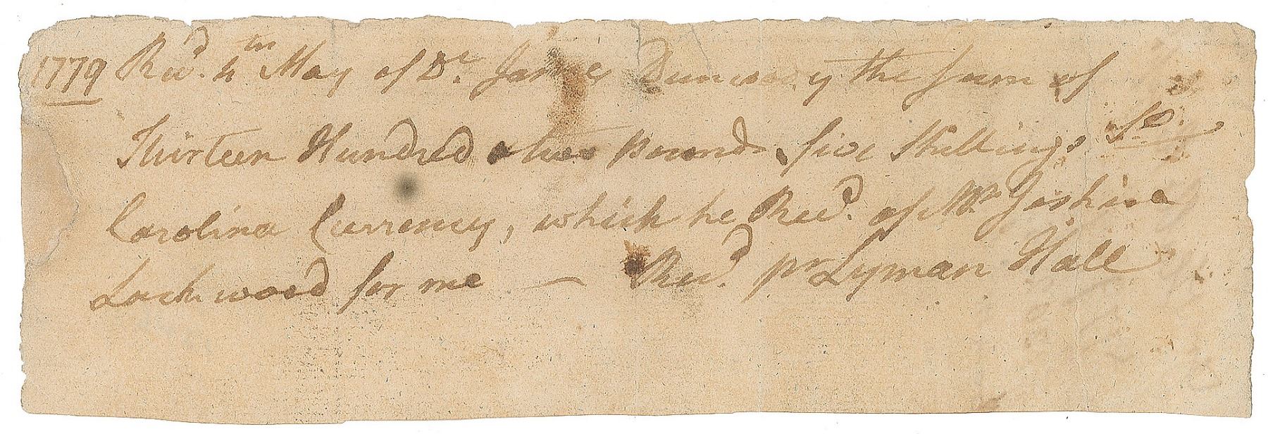 Signer of the Declaration of Independence from Georgia (1724–1790) who went on to serve as governor of the state. Rare Revolutionary War–dated ADS, one page, 7.5 x 2.5, May 4, 1779. Receipt of payment, in part: "1779, Rec'd 4th May of Dr. James Dunsany the sum of Thirteen Hundred & two pounds five shillings…Carolina Currency, which he Rec'd of Mr. Joshua Lockwood for me—Rec'd pr Lyman Hall." In very good to fine condition, with a few repaired edge tears. Hall remains among the rarest of all Declaration signers.