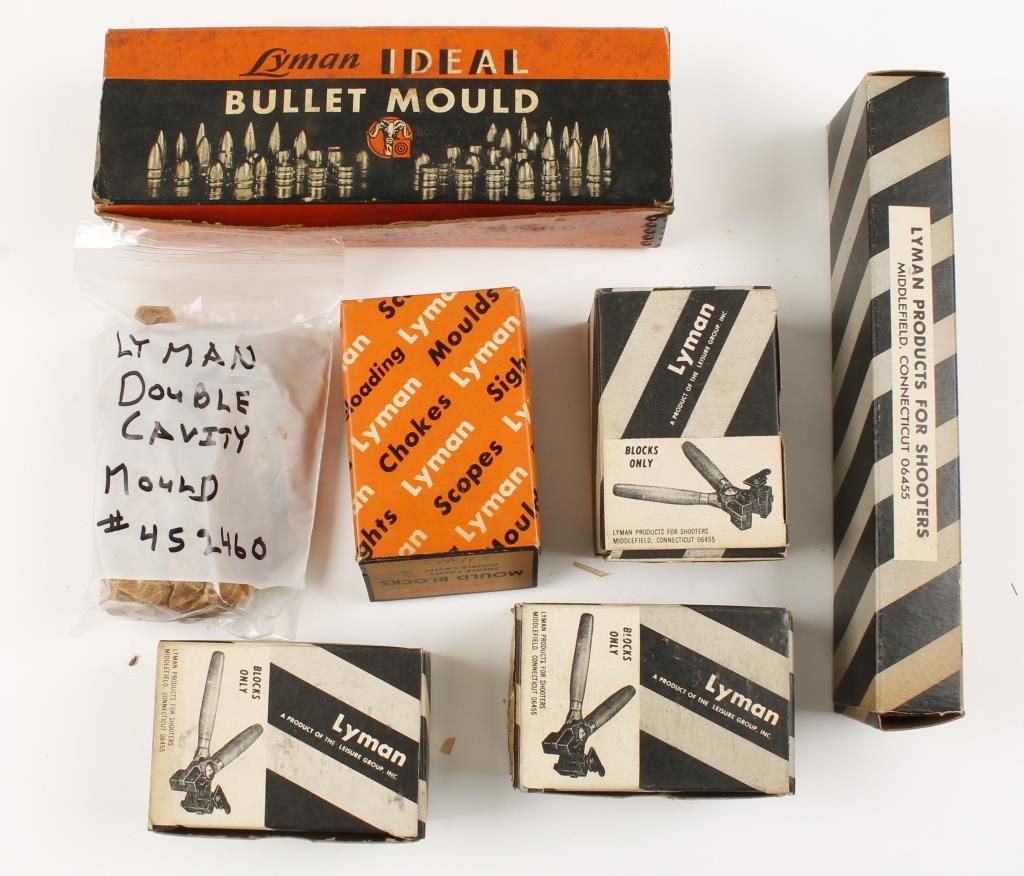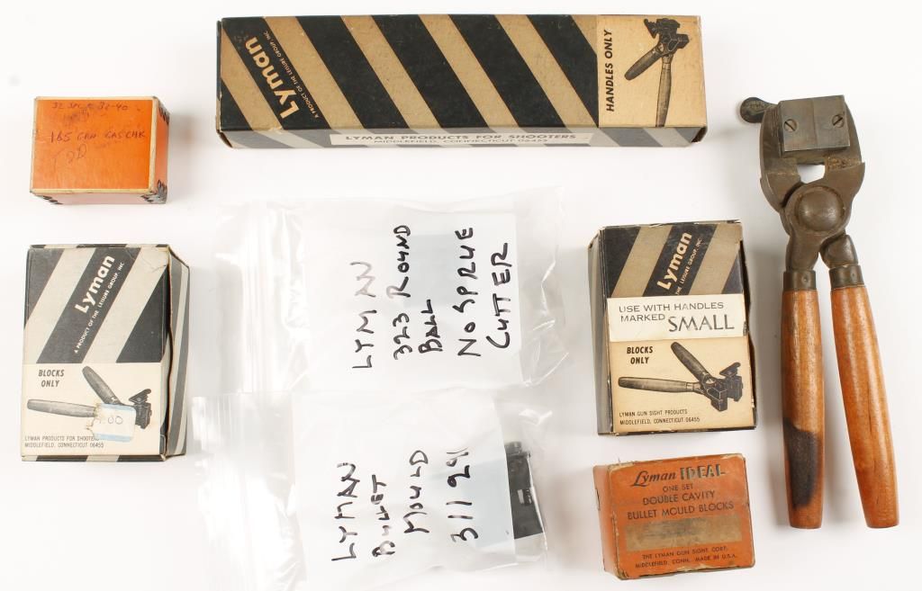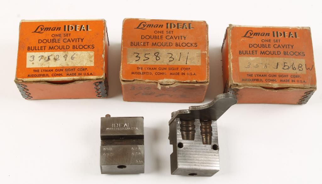 Includes: Lee 457500, Lee 90314, Lyman single cavity moulds: 225462, 311291, 323470, 356407, 358432, 311468, 323 round ball, Lyman double cavity moulds: 358156BW, 358311, 375296, 358429, 452423, 245496, 257312, 311413, 358156, 40043, 452460, 6 sets of handles, unmarked hollow base, and not named molds 3118 & 358311.