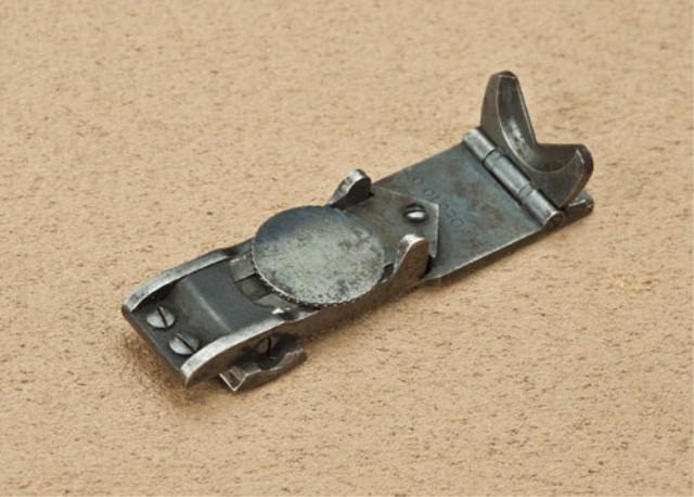 Lyman No. 46 Elevating Leaf Rear Sight, Pat. Dec 10, 1907. The No. 46 was intended for use with the No. 6 Folding Sight. The small stop screw adjusts for point blank, for higher elevation raise the slide, push forward on the knurled head screw th retighten. This will hold the position you wish. Discontinued in 1919. Fine condition. Very Rare! Est. $500-1,000
