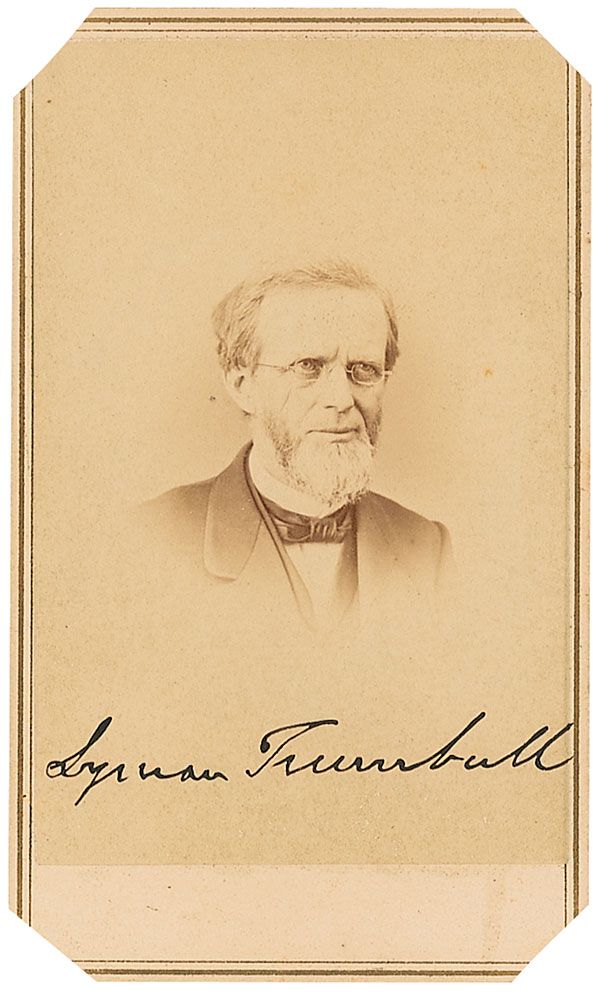 Original 2.25 x 4 carte-de-visite bust portrait of Trumbull by Alexander Gardner, signed on the image in black ink. In very good condition, with clipped corners, light toning, and a two-cent revenue stamp affixed to the reverse.
