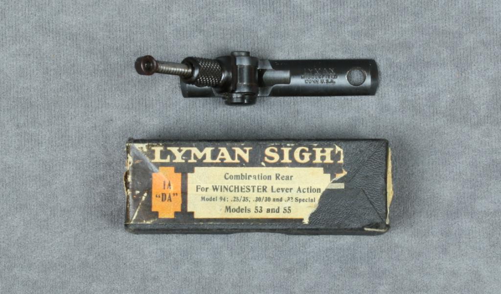 Lyman adjustable tang sight in original factory box in like new condition with directions and note that it is for Winchester lever action rifles; Models 94, 53 & 55. Est.: $30-$60.
