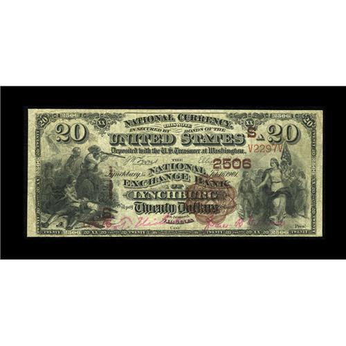 <B>Lynchburg, VA</B></I> - $20 1882 Brown Back Fr. 504 <B>The National Exchange Bank</B></I> Ch. # (S)2506<BR>This bank closed in 1913 after having issued First and Second Charter designs. The census previously included 11 Large Size notes. This discovery is the 12th and the first $20 Brown Back known from here. A nice <B>Fine</B></I> with red stamped officers' signatures, it should attract considerable interest from Virginia specialists.<BR><I>From The George P. Hammerly Collection</B></I><BR><BR><b>Shipping:</b> Coin/Currency (<a target="_blank" href="http://www.heritageauctions.com/common/shipping.php">view shipping information</a>)