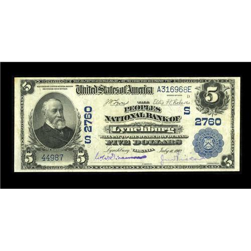 <B>Lynchburg, VA</B></I> - $5 1902 Plain Back Fr. 598 <B>The Peoples NB</B></I> Ch. # (S)2760<BR>Although not an especially scarce bank, tonight's offering is a bright and nicely margined <B>Very Fine</B></I> that enjoys considerable aesthetic endowments.<BR><I>From The George P. Hammerly Collection</B></I><BR><BR><b>Shipping:</b> Coin/Currency (<a target="_blank" href="http://www.heritageauctions.com/common/shipping.php">view shipping information</a>)
