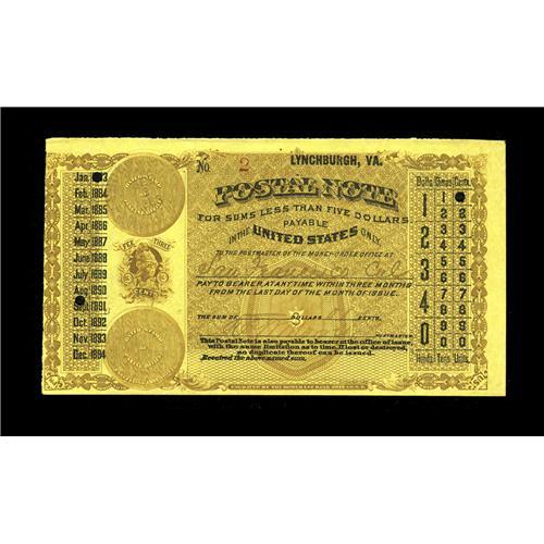 <B>Lynchburgh (sic), VA Postal Note</B></I><BR>This is the first of four exceptional Postal Notes we are privileged to offer from the collection of Arlie Slabaugh, whose collection of Postal Savings Notes and memorabilia is offered in this section. The Postal Notes are all unusually high grade specimens and represent the progression of these notes from their inauguration in September of 1883, as each represents a different design or printer. This note, a serial number 2 example from Lynchburgh, Virginia, grades <B>About Uncirculated</B></I> and was clearly put away by a far sighted collector at the time these items first became available. This note is the first type issued, which is printed in brown and black inks on yellow paper with an ornate reverse. It was engraved and printed by the Homer Lee Bank Note Company.