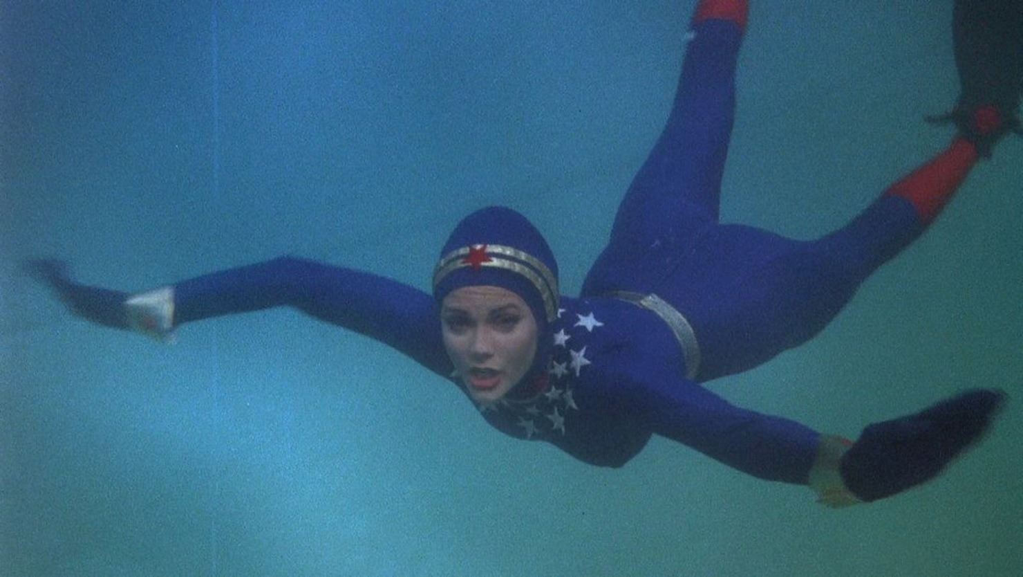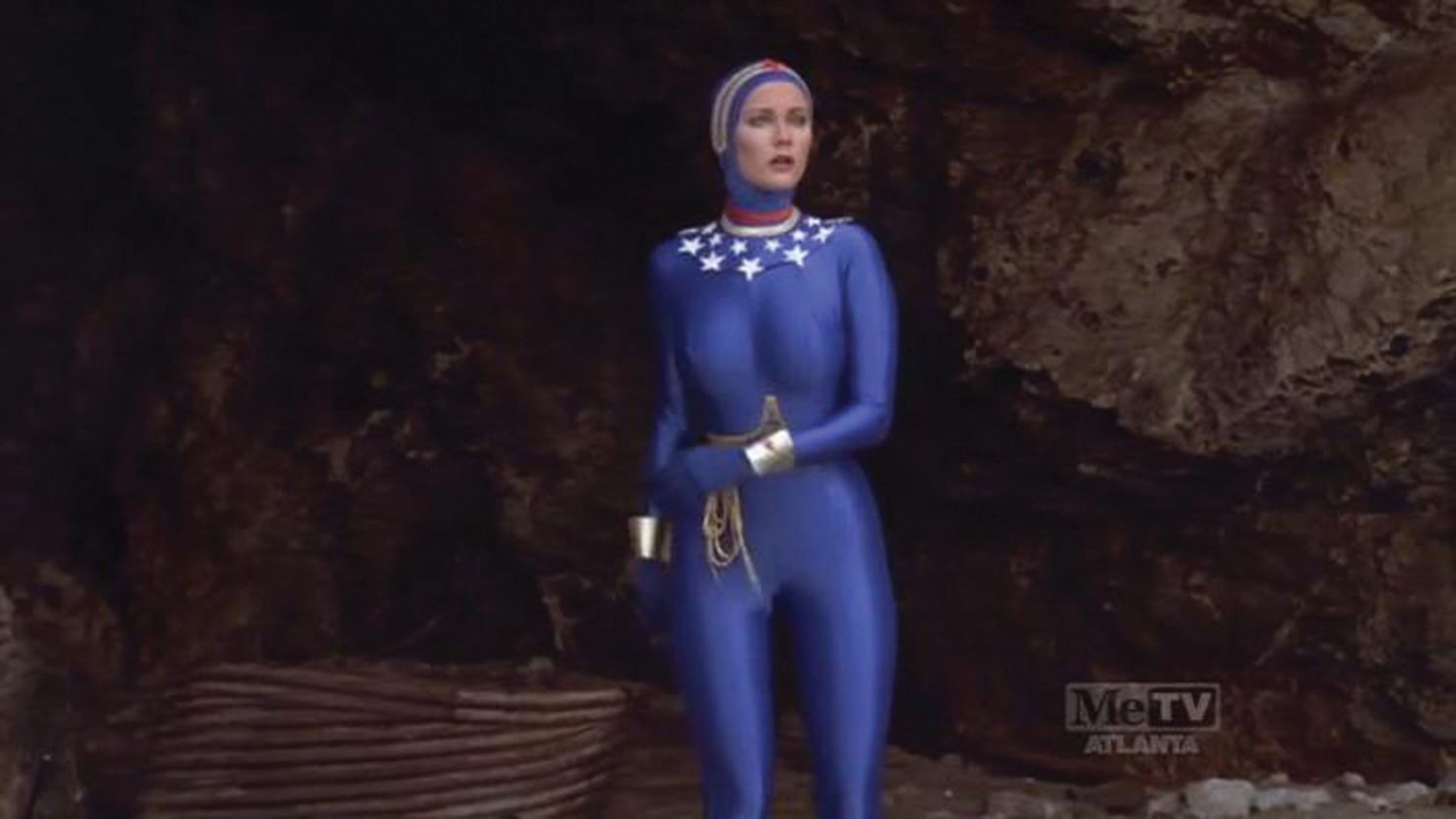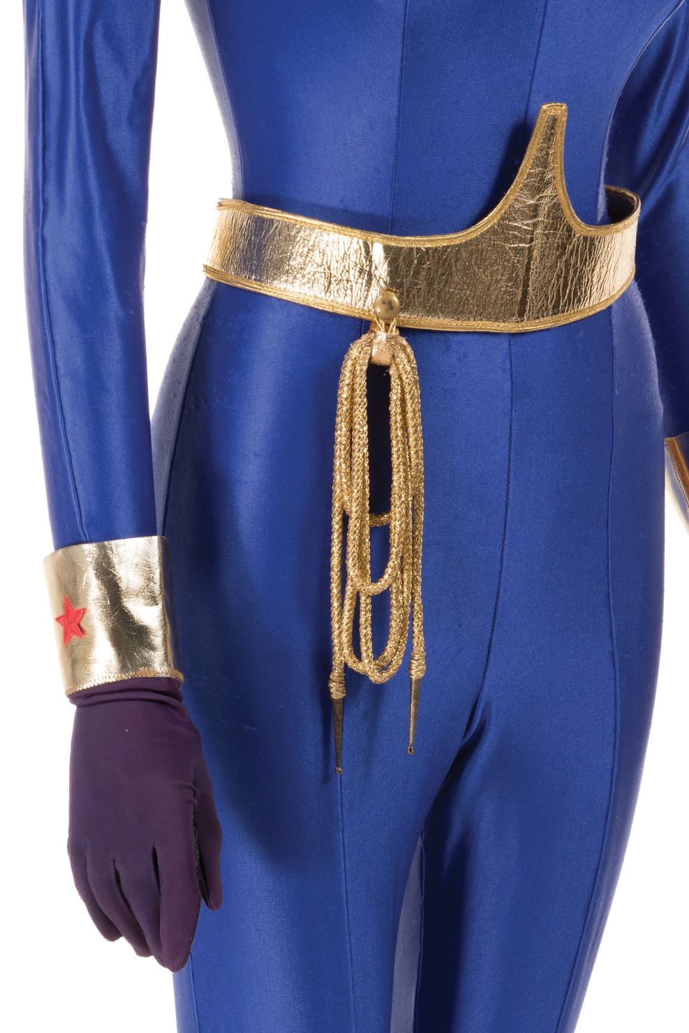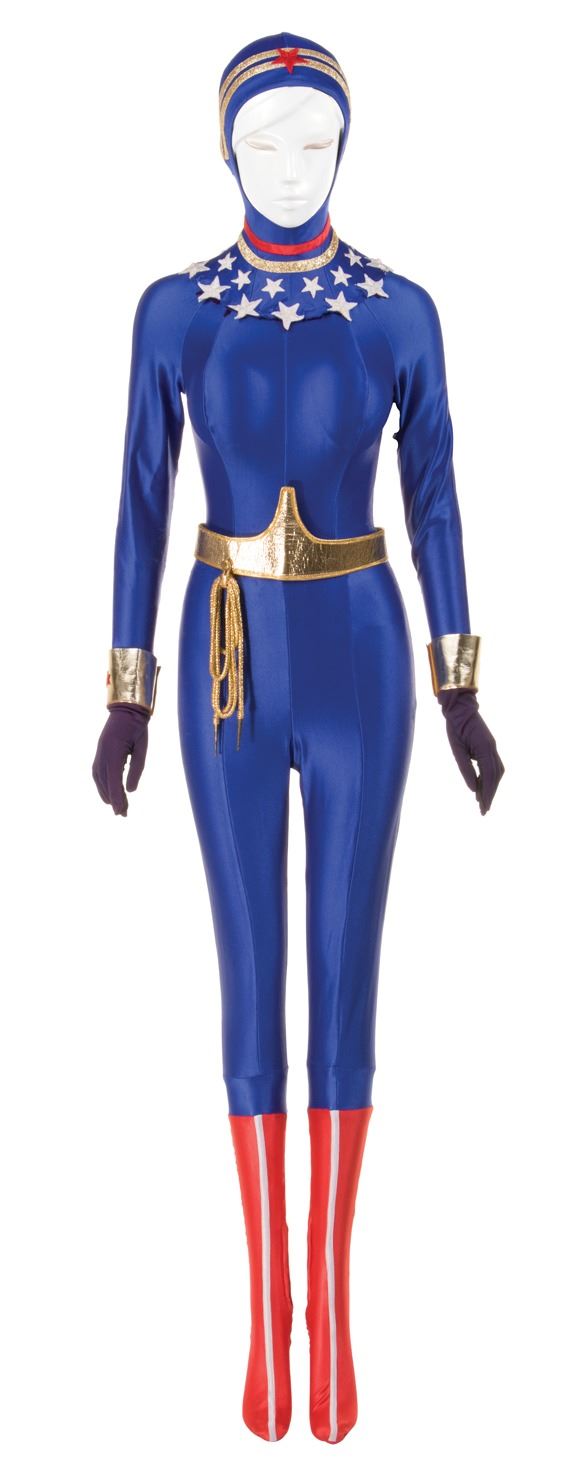 129. Lynda Carter Wonder Woman Aquanaut ensemble and golden lasso of truth from Wonder Woman. (WB TV, 1975-79) Vintage original (5) piece ensemble including (1) royal blue full body spandex suit with single finger holes at cuffs, integral red and white spandex "boots" with side zippers, velcro at neck, waist and cuffs for attaching other pieces, (1) matching full head cowl with applique embroidered red and white stars and metallic gold and red satin stripes, with interior velcro for attaching to suit, and zipper back closure, (1) pair navy blue spandex gloves with metallic gold leather uppers with applique red embroidered stars, black suede strips on palms/fingers, and interior velcro for attaching to suit, (1) metallic gold vinyl belt with loop for golden lasso and interior velcro strips, retaining costumer's handwritten, "Lynda", "[Beth] (crossed out), and "Water", in black ink, and (1) signature golden lasso with metal tips. Exhibiting only minor production wear. In vintage fine condition. Comes with a LOA from the Comisar Collection. $20,000 - $30,000