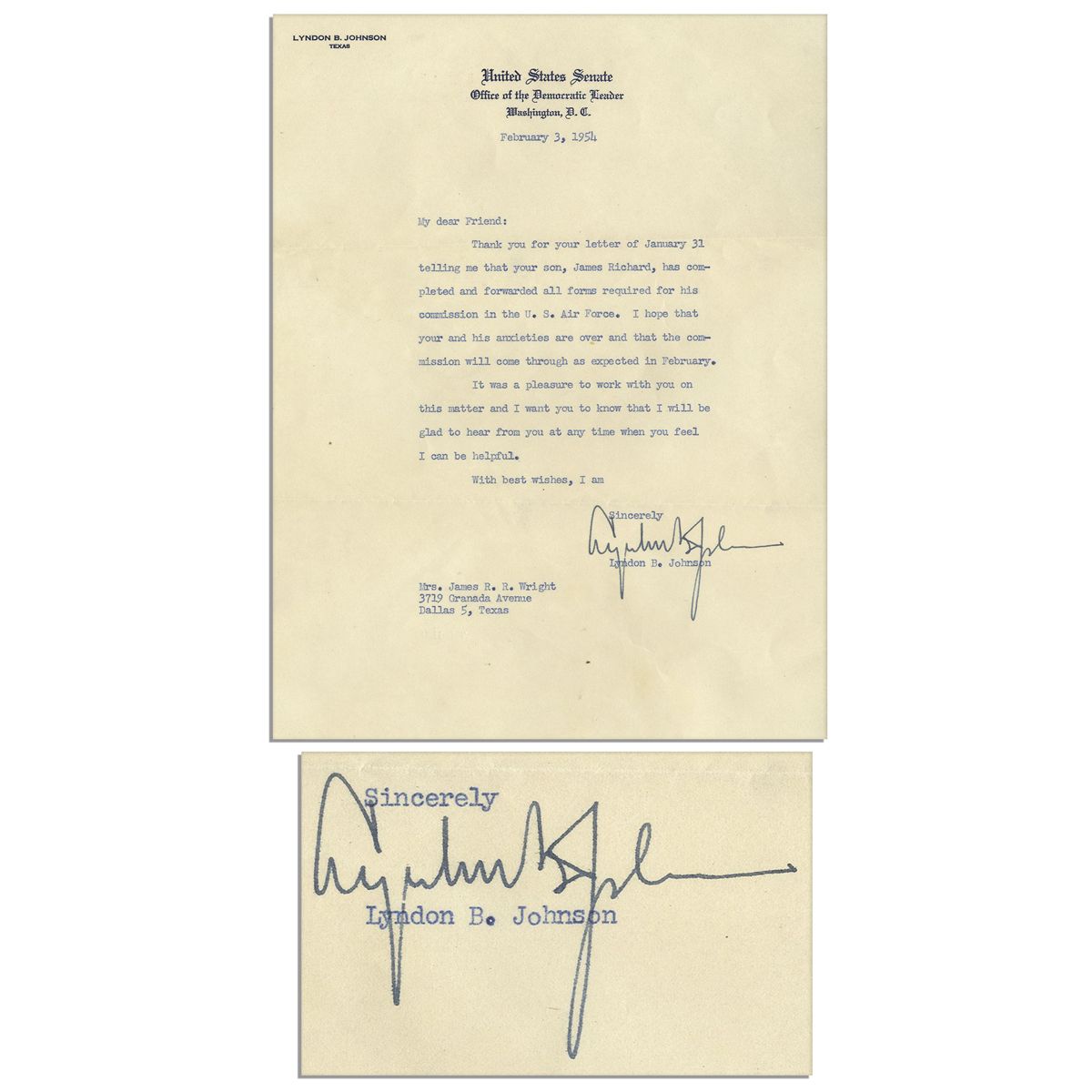 Lyndon B. Johnson typed letter signed as Senate Majority Leader. Letter upon U.S. Senate Office of the Democratic Leader stationery is dated 3 January 1954. Addressed to Mrs. James R.R. Wright, letter reads in part, ''Thank you for your letter...telling me that your son, James Richard, has completed and forwarded all forms required for his commission in the U.S. Air Force. I hope that your and his anxieties are over and that the commission will come through as expected in February...[signed] Lyndon B. Johnson''. Accompanied by the free franked envelope bearing Johnson's printed signature and Wright's U.S. Air Force Certificate of Proficiency, one of the forms referenced. Single-page letter measures 8'' x 10.5''. Creasing, else near fine.