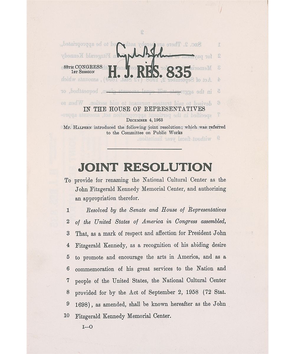 DS as president, one page both sides, 7.5 x 11, 88th Congress H. J. Res. 835 letterhead, December 4, 1963. Copy of the official government printed House Joint Resolution 835. Resolution reads, in part, “Joint Resolution to provide for renaming the National Cultural Center as the John Fitzgerald Kennedy Memorial Center, and authorizing an appropriation therefor. Resolved by the Senate and House of Representatives of the United States of America in Congress assembled, that as a mark of respect and affection for President John Fitzgerald Kennedy, as a recognition of his abiding desire to promote and encourage the arts in America, and as a commemoration of his great services to the Nation and the people of the United States, the National Cultural Center provided for by the Act of September 2, 1958…as amended, shall be known hereafter as the John Fitzgerald Kennedy Memorial Center.” In fine condition. Johnson would dig the ceremonial first shovel of dirt at the groundbreaking for the center, which would finally open in 1971 with a premiere of Leonard Bernstein’s ‘Mass.’