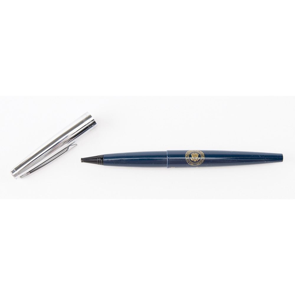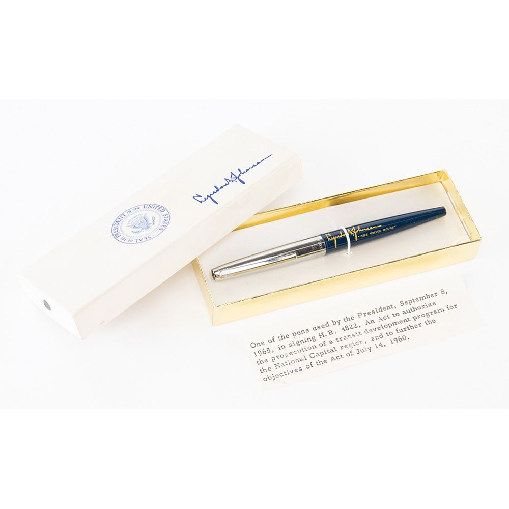 Felt tip pen used by President Lyndon B. Johnson to sign ‘An Act to authorize the prosecution of a transit development program for the National Capital region, and to further the objectives of the Act of July 14, 1960’ (H. R. 4822). The official 'bill signer' Eversharp pen measures 5.25˝ long and features a navy-blue plastic barrel bearing a gold facsimile signature with presidential seal and a silver-tone cap section. Accompanied by the original presentation box with presidential seal and facsimile signature of President Johnson, as well as a typed caption affirming that the pen was “used by the President, September 8, 1965, in signing H. R. 4822." In fine condition.