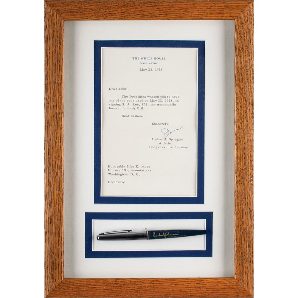 Felt tip pen used by President Lyndon B. Johnson to sign ‘the Automobile Insurance Study Bill' (S.J. Res. 129). The official 'bill signer' Eversharp pen measures 5.25˝ long and features a navy-blue plastic barrel bearing a gold facsimile signature with presidential seal and a silver-tone cap section. Includes a letter from Irvine H. Sprague to Congressman John E. Moss, May 23, 1968, in full: "The President wanted you to have one of the pens used on May 22, 1968, in signing S. J. Res. 129, the Automobile Insurance Study Bill." Matted and framed together to an overall size of 10 x 14.5. In fine condition. John E. Moss represented California's 3rd District in the House of Representatives from 1953 to 1978.