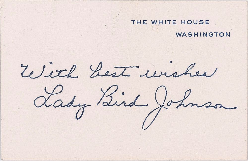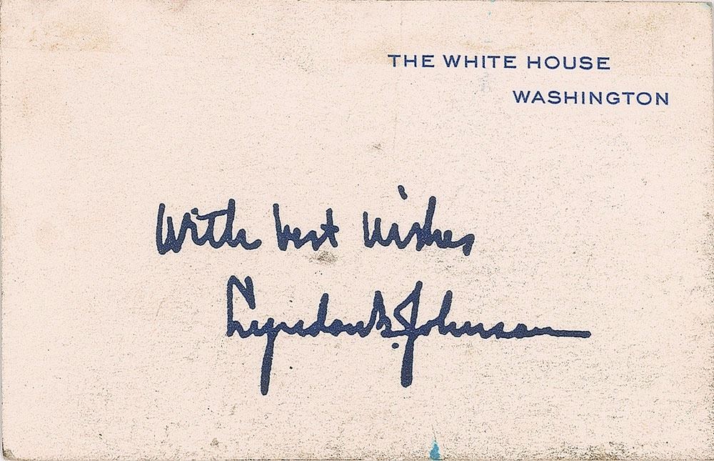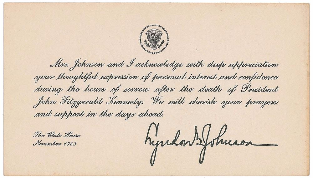 Three items: an original printed condolence card sent from the White House following Kennedy's assassination, 6 x 3.5, bearing a printed facsimile of Johnson's signature at the bottom, in part: "Mrs. Johnson and I acknowledge with deep appreciation your thoughtful expression of personal interest and confidence during the sorrow after the death of President John Fitzgerald Kennedy"; and two 3.75 x 2.5 White House cards bearing printed facsimile signatures of the president and first lady. In overall very good to fine condition, with soiling to the LBJ White House card.