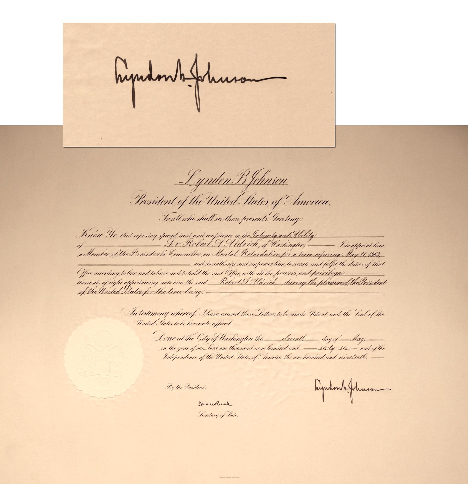 Exceptionally large document signed by Lyndon Baines Johnson as President, dated 17 May 1966. Here LBJ appoints a Dr. Robert A. Aldrich to the President's Committee on Mental Retardation. Countersigned by Dean Rusk as Secretary of State. Large document measures 23'' x 19'' and includes a fine United States seal to lower left. Document has been mounted to board, resulting in some rippling near, but not on Johnson's signature, else fine.