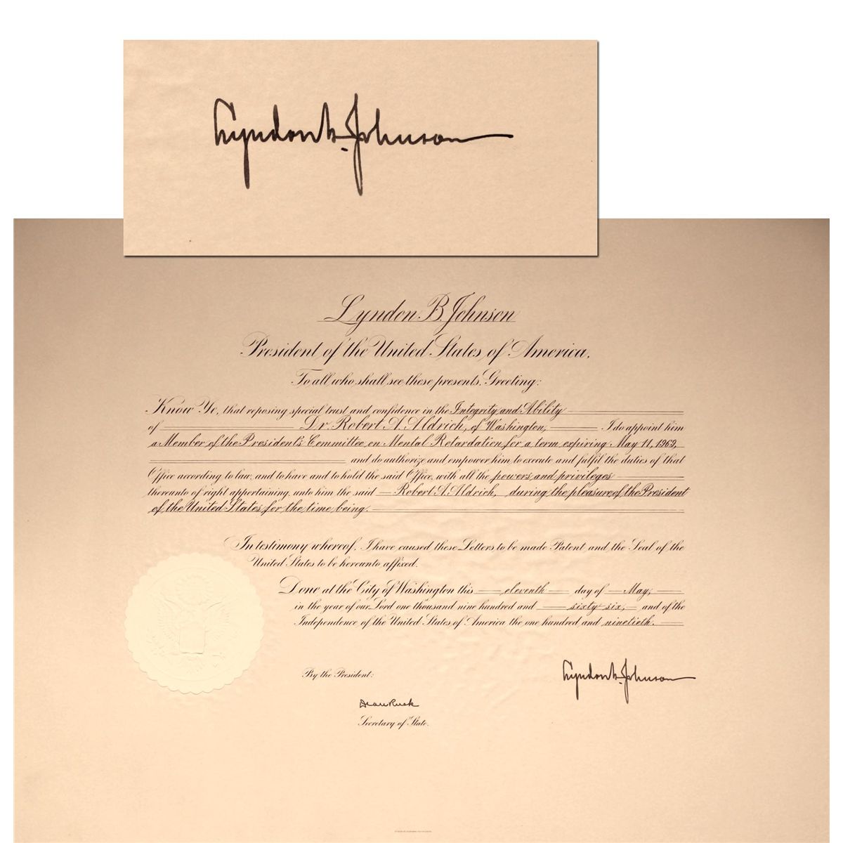 Exceptionally large document signed by Lyndon Baines Johnson as President, dated 17 May 1966. Here LBJ appoints a Dr. Robert A. Aldrich to the President's Committee on Mental Retardation. Countersigned by Dean Rusk as Secretary of State. Large document measures 23'' x 19'' and includes a fine United States seal to lower left. Document has been mounted to board, resulting in some rippling near, but not on Johnson's signature, else fine.