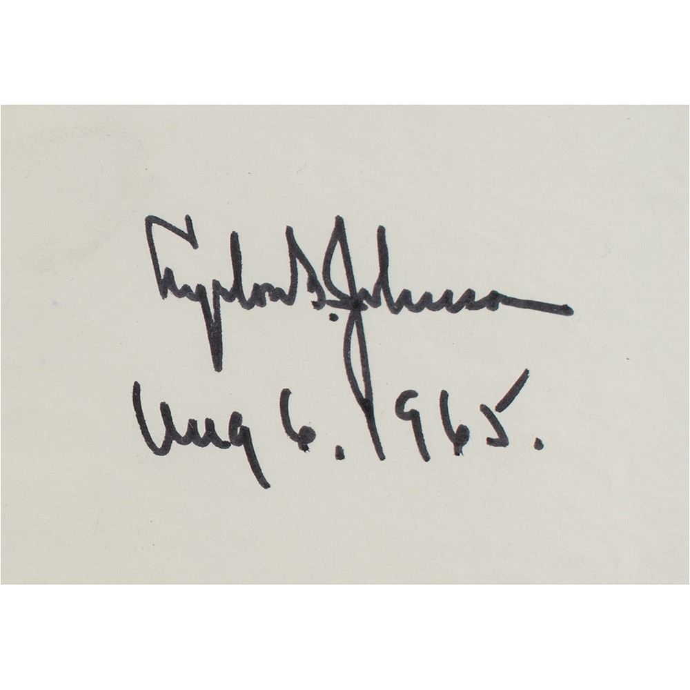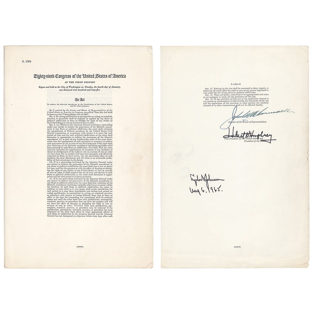 DS as president, signed “Lyndon B. Johnson, Aug. 6, 1965,” ten pages, 10 x 15, August 6, 1965. Official printing of the landmark Voting Rights Act of 1965, "S. 1564: An Act To enforce the fifteenth amendment to the Constitution of the United States, and for other purposes," signed at the conclusion by President Lyndon B. Johnson, Vice President Hubert H. Humphrey, and Speaker of the House John McCormack. In part: "No voting qualification or prerequisite to voting, or standard, practice, or procedure shall be imposed or applied by any State of political subdivision to deny or abridge the right of any citizen of the United States to vote on account of race or color." In very good to fine condition, with some edge creasing.