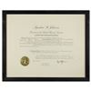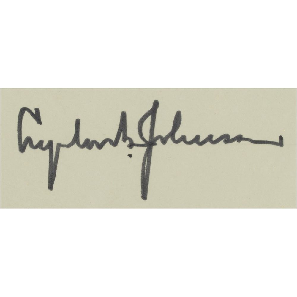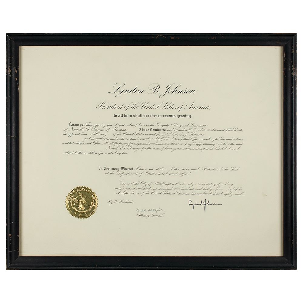 Partly-printed DS as president, one page, 19.5 x 15.5, May 22, 1965. President Johnson appoints Newell A. George of Kansas to be "Attorney of the United States, in and for the District of Kansas." Signed at the conclusion by President Johnson and countersigned by Attorney General Nicholas Katzenbach. The gold foil Department of Justice seal affixed to the lower left remains fully intact. Framed and in fine condition.