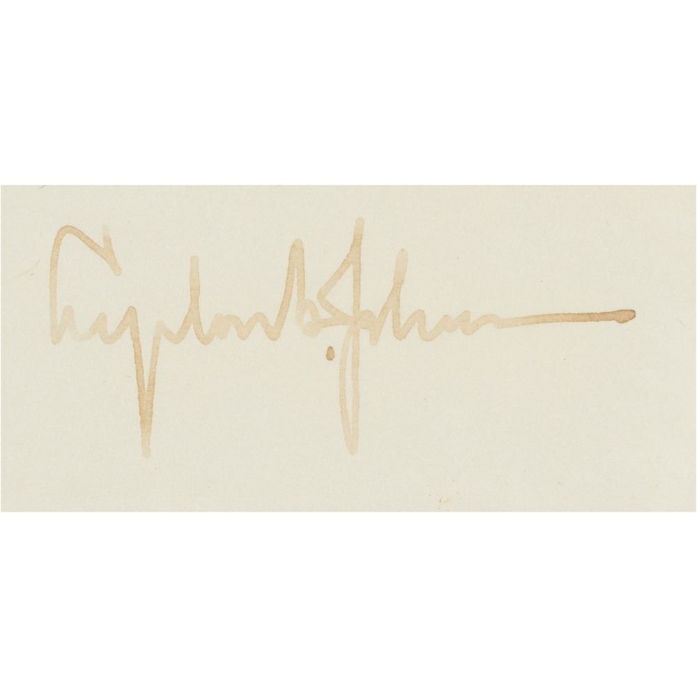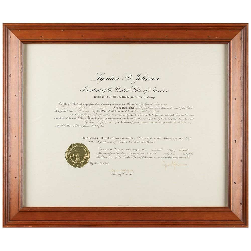 Partly-printed DS as president, one page, 19.5 x 15.5, August 11, 1965. President Johnson appoints Sylvan A. Jeppesen of Idaho as "Attorney of the United States, in and for the District of Idaho." Signed at the conclusion by President Johnson and countersigned by Attorney General Nicholas Katzenbach. The gold foil Department of Justice seal affixed to the lower left remains intact. Framed to an overall size of 23.5 x 19.5. In very good to fine condition, with light overall wrinkling (apparently from mounting), and some fading to the signature.