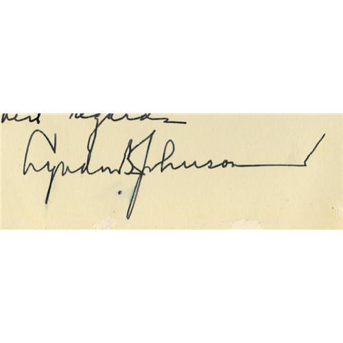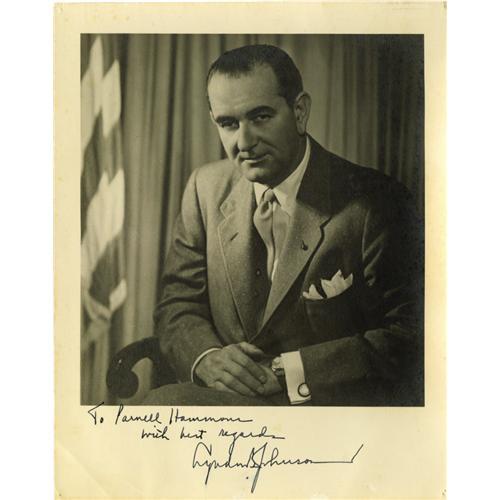 <B>Lyndon B. Johnson Inscribed Signed Photograph</B></I> "<I>To Parnell Hammons with best regards Lyndon B Johnson</B></I>". 8" x 10" with inscription on lower margin. A pre-presidential portrait made while Johnson was a U.S. Senator from Texas. Nice, clear signature centered beneath the portrait. Minimal aging, fine condition.