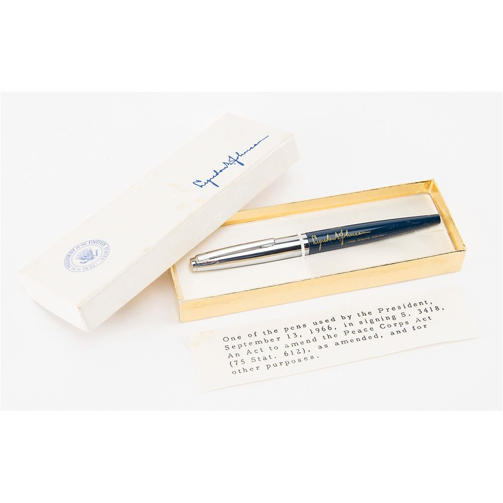 Felt tip pen used by President Lyndon B. Johnson to sign ‘An Act to amend the Peace Corps Act (75 Stat. 612), as amended, and for other purposes' (S. 3418). The official 'bill signer' Eversharp pen measures 5.25Ë long and features a navy-blue plastic barrel bearing a gold facsimile signature with presidential seal and a silver-tone cap section. Accompanied by the original presentation box with presidential seal and facsimile signature of President Johnson, as well as a typed caption affirming that the pen was “used by the President on September 13, 1966, in signing S. 3418." In fine condition, with some staining to the front of the original box. Approved on September 22, 1961, the Peace Corps Act (75 Stat. 612) was designed to provide for a Peace Corps to help the peoples of interested countries and areas in meeting their needs for skilled manpower.