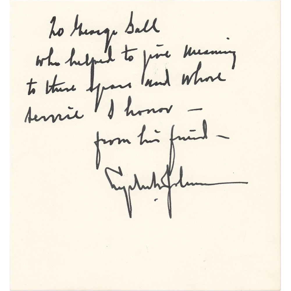 Bold ink signature and inscription, "To George Ball, who helped to give meaning to these years and whose service I honor—from his friend, Lyndon B. Johnson,†on an off-white 6 x 6.5 sheet. In very fine condition. Holographic material from Johnson remains quite rare, with this autograph bearing a wonderful political association.