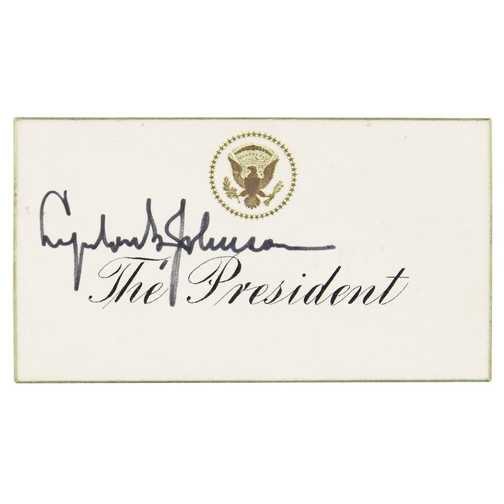 Felt tip signature, “Lyndon B. Johnson,†on a beveled 4 x 2.25 placed card calligraphically inscribed “The President†below an embossed presidential seal. In fine condition.