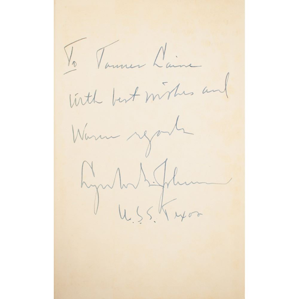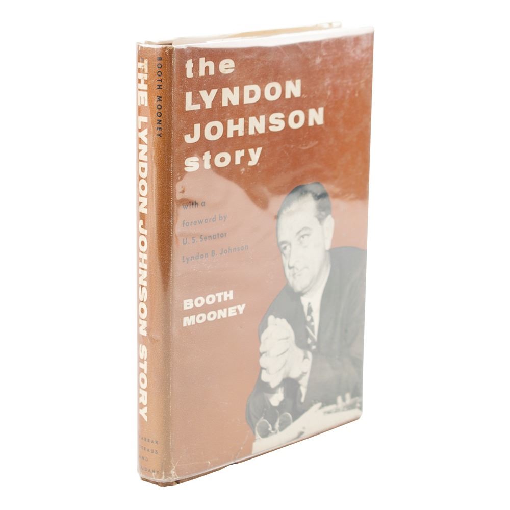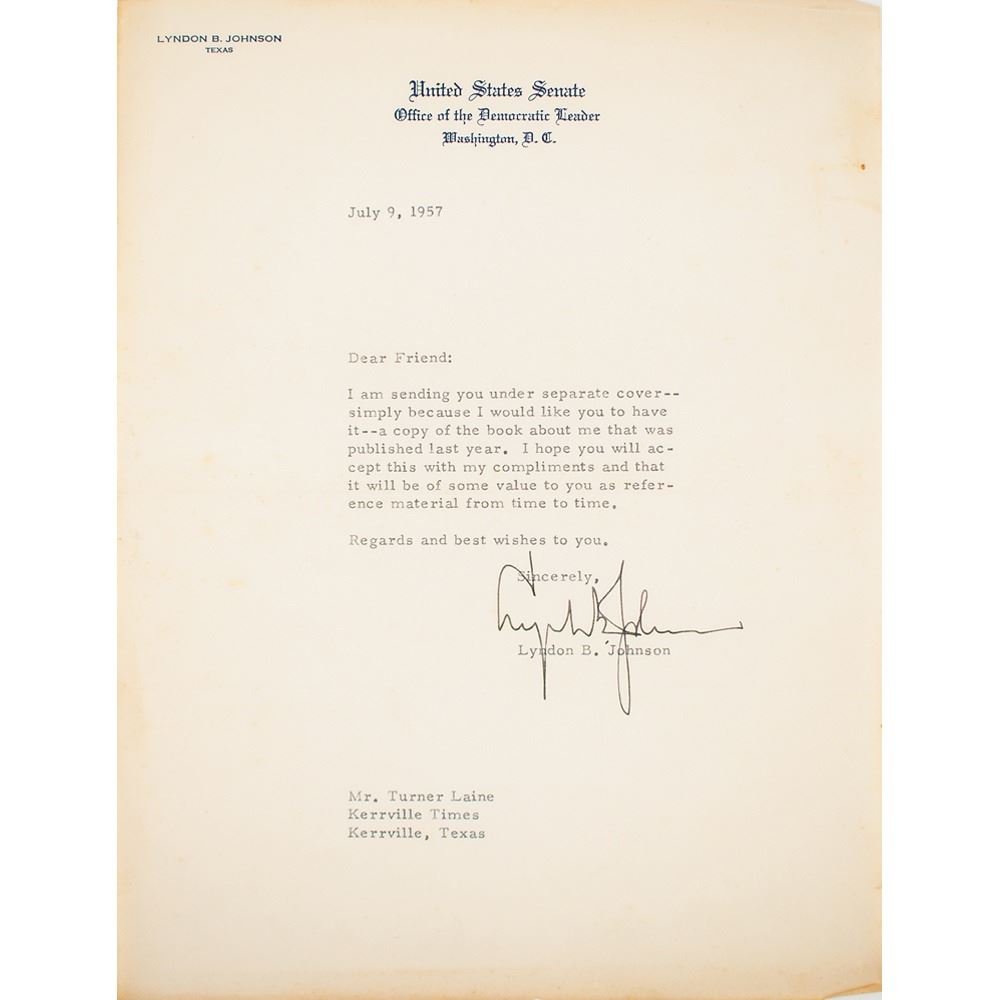 Signed book: The Lyndon Johnson Story by Booth Mooney. First edition, first printing. NY: Farrar, Straus and Company, 1956. Hardcover, 5.75 x 8.5, 178 pages. Signed and inscribed on the first free end page in fountain pen, "To Turner Laine, with best wishes and warm regards, Lyndon B. Johnson, U.S.S. Texas." Includes the typed transmittal letter, signed "Lyndon B. Johnson," one page, 8 x 10.5, United States Senate letterhead, July 9, 1957, in part: "I am sending you under separate cover—simply because I would like you to have it—a copy of the book about me that was published last year. I hope you will accept this with my compliments and that it will be of some value to you as reference material from time to time." Book condition: VG/VG, with light mottled toning to the signed page, a ding to the bottom of the front board, and a few small edge tears and light foxing to the jacket; the letter is in very good to fine condition, with scattered light foxing and staining.