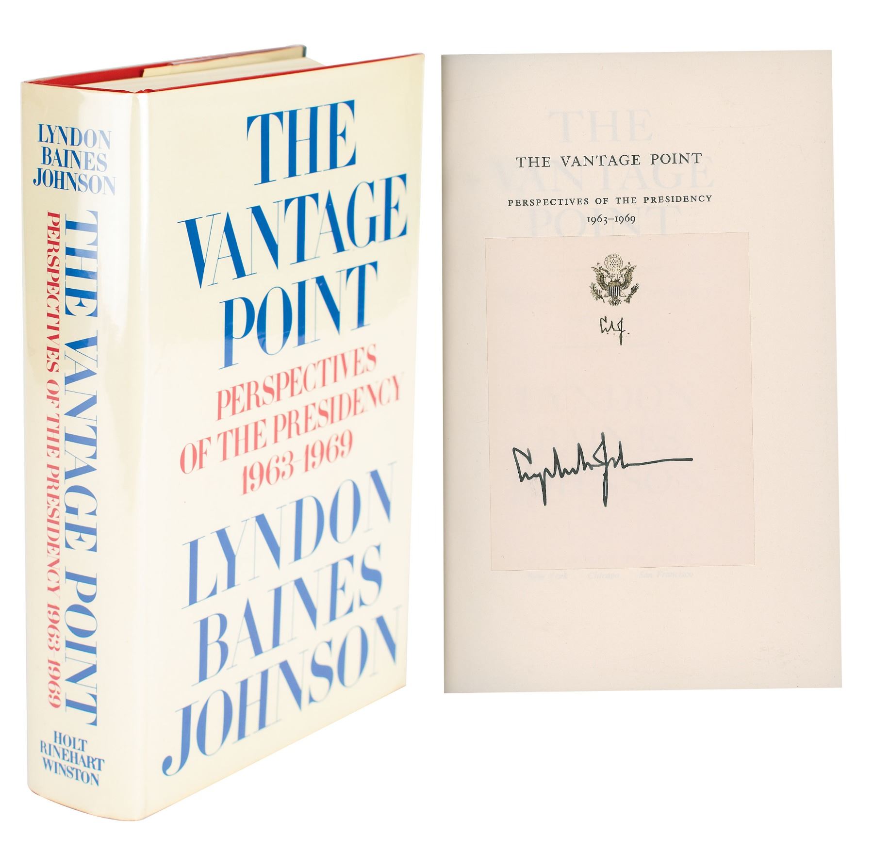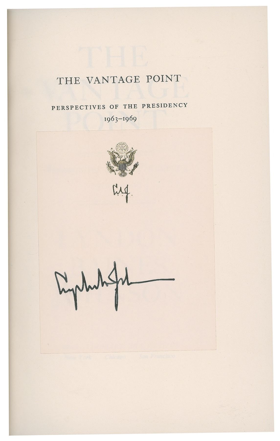 Signed book: The Vantage Point: Perspectives of the Presidency, 1963–1969. First edition. NY: Holt, Rinehart and Winston, 1971. Hardcover with dust jacket, 6.5 x 9.5, 636 pages. Signed in fountain pen on a personal bookplate affixed to the half-title page. In fine to very fine condition.