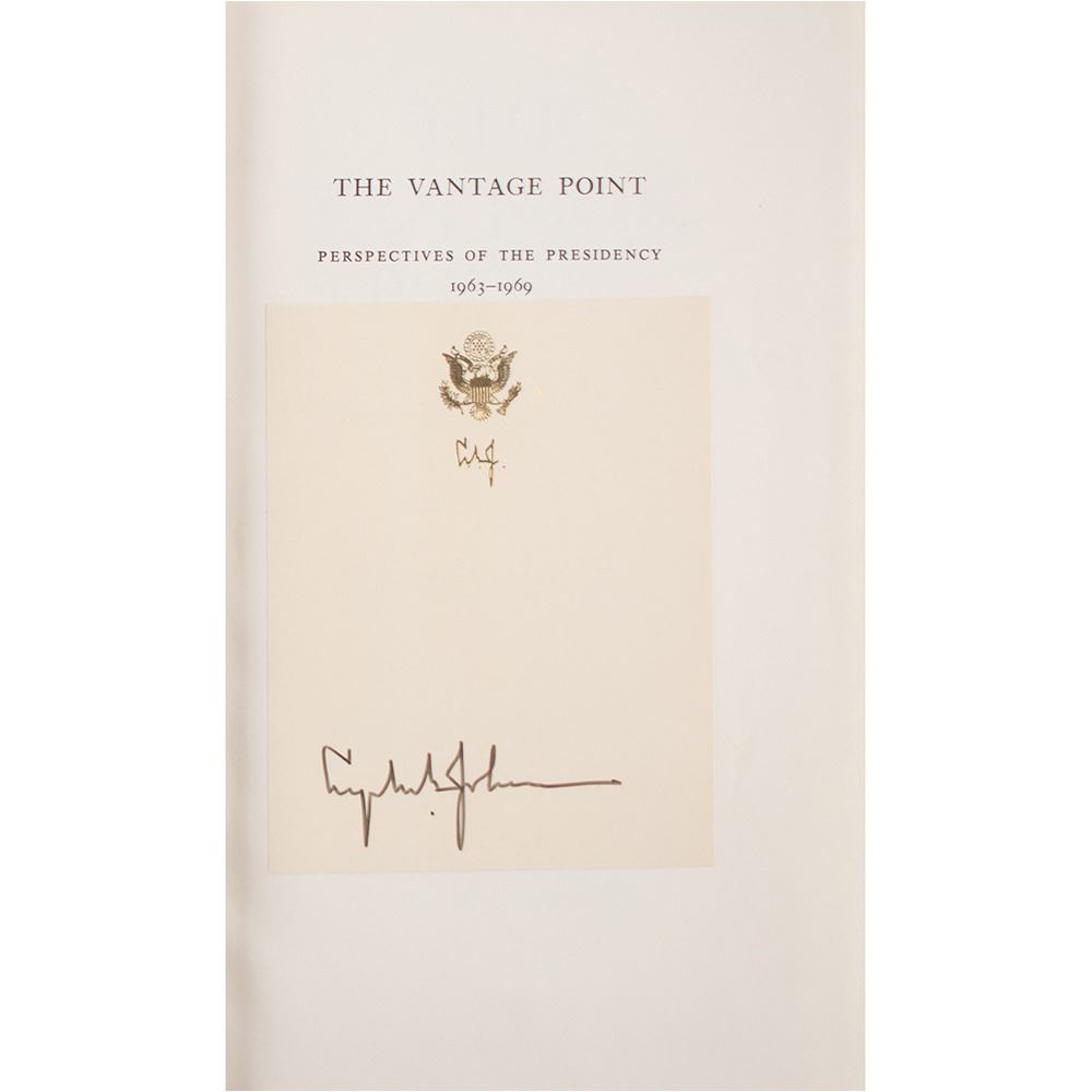 Signed book: The Vantage Point: Perspectives of the Presidency, 1963–1969. First edition. NY: Holt, Rinehart and Winston, 1971. Hardcover with dust jacket, 6.5 x 9.5, 636 pages. Signed in fountain pen on a bookplate affixed to the half-title page. In very good to fine condition, with delamination, toning, wear, and tears to the dust jacket.