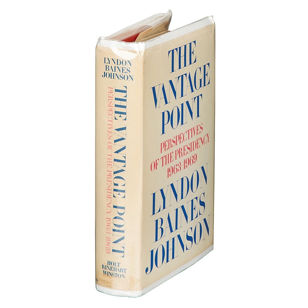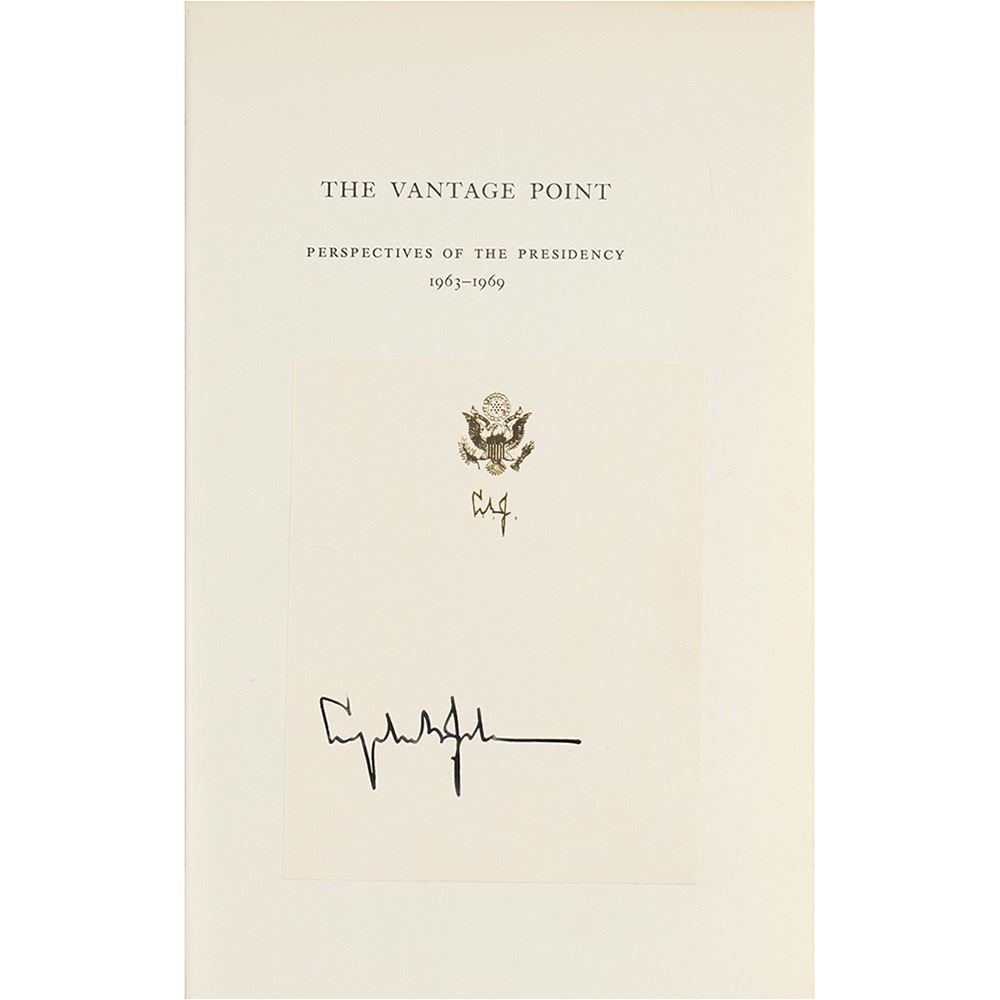 Signed book: The Vantage Point. First edition. NY: Holt, Rinehart and Winston, 1971. Hardcover with dust jacket, 6.5 x 9.5, 636 pages. Signed by Lyndon B. Johnson in black ink on a bookplate affixed to the half-title page. In fine condition, with some light wear to the dust jacket.