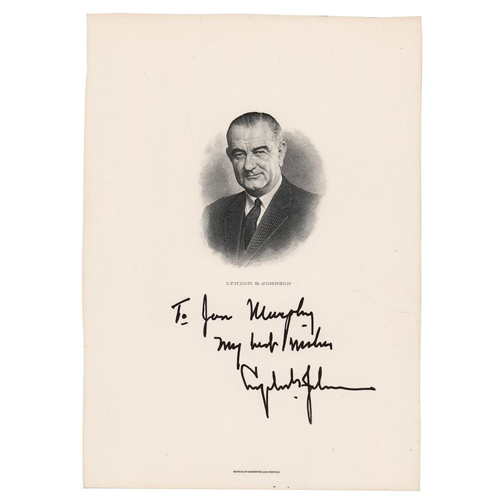 Uncommon 5 x 7 engraved portrait of Lyndon B. Johnson by the Bureau of Engraving and Printing, signed and inscribed in black ink, “To Jon Murphy, my best wishes, Lyndon B. Johnson.” In fine condition, with trimmed edges.