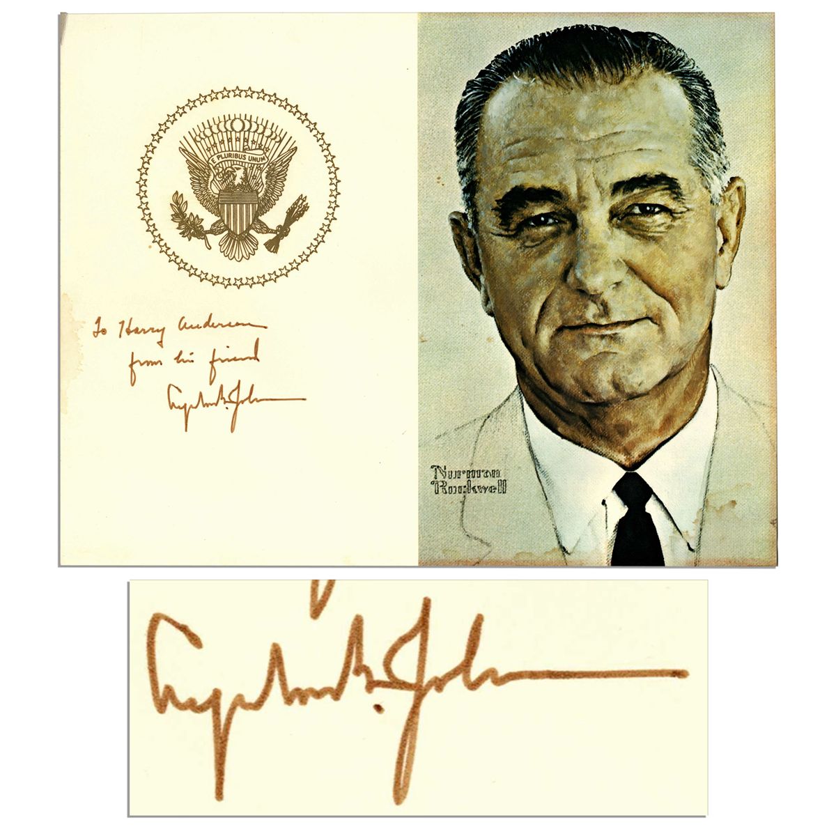 Rare Lyndon B. Johnson signed print of his portrait by Norman Rockwell. Johnson inscribes the left side of the print to his Assistant Secretary of the Interior, ''To Harry Anderson / from his friend / Lyndon B. Johnson''. Autograph inscription appears in the white space below a large gilt presidential seal on the left half of the page. Opposite is Norman Rockwell's portrait of an almost smiling Johnson. Measures 14'' x 11''. Toning and faint staining along the left edge, else near fine.