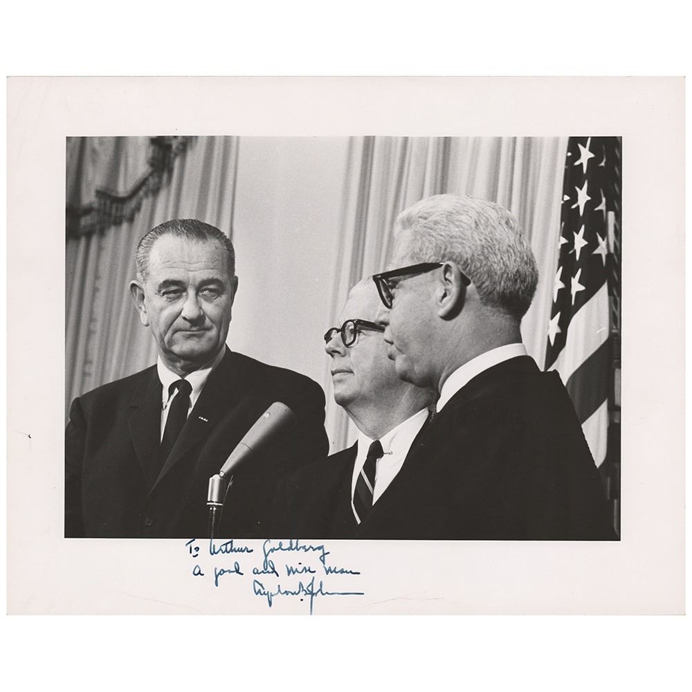 Semi-glossy 14 x 11 silver gelatin photo of Johnson standing next to Arthur Goldberg and another gentleman, signed and inscribed in the lower border in fountain pen, "To Arthur Goldberg, a good and wise man, Lyndon B. Johnson.‰Û In very good to fine condition, with scattered light creasing, a bit heavier in the borders.