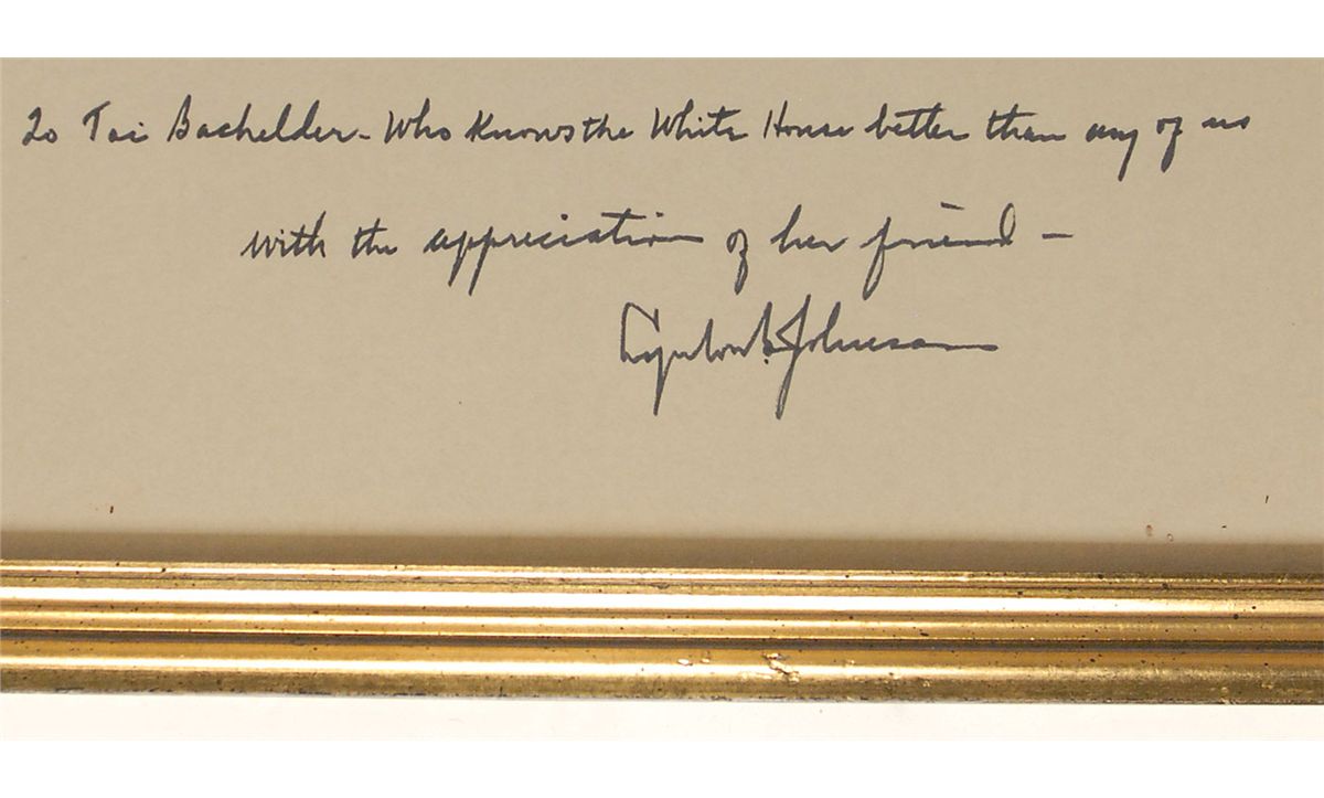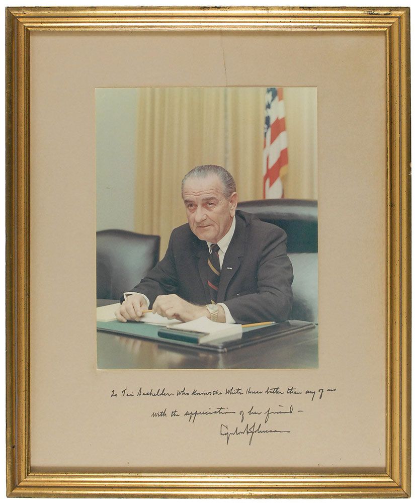 Color semi-glossy 7.5 x 9.5 photo of Johnson in the White House, affixed to a 12 x 15 mount, signed and inscribed on the mount in black ink, as president, “To Toi Bachelder, who knows the White House better than any of us, with appreciation of her friend—Lyndon B. Johnson.” Bachelder joined the White House staff following the inauguration of President Franklin D. Roosevelt in 1933 and continued working there for Presidents Truman, Eisenhower, Kennedy, and Johnson before retiring in 1967. President Johnson was so impressed with her service, particularly as a member of FDR’s inner circle, that he gave a private retirement party for her in the White House. Framed to an overall size of 13.5 x 16.5. In fine condition, with a few light creases and ripples to edges of photo (due to adhesive on reverse), and a vertical separation to top edge of mount.