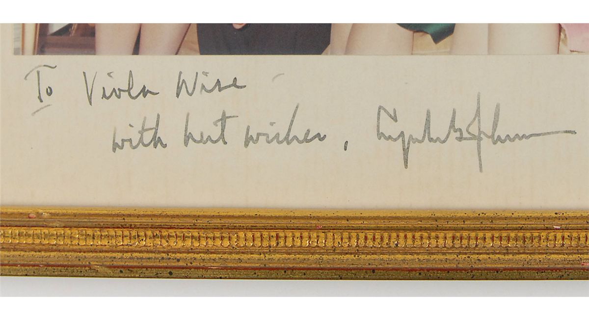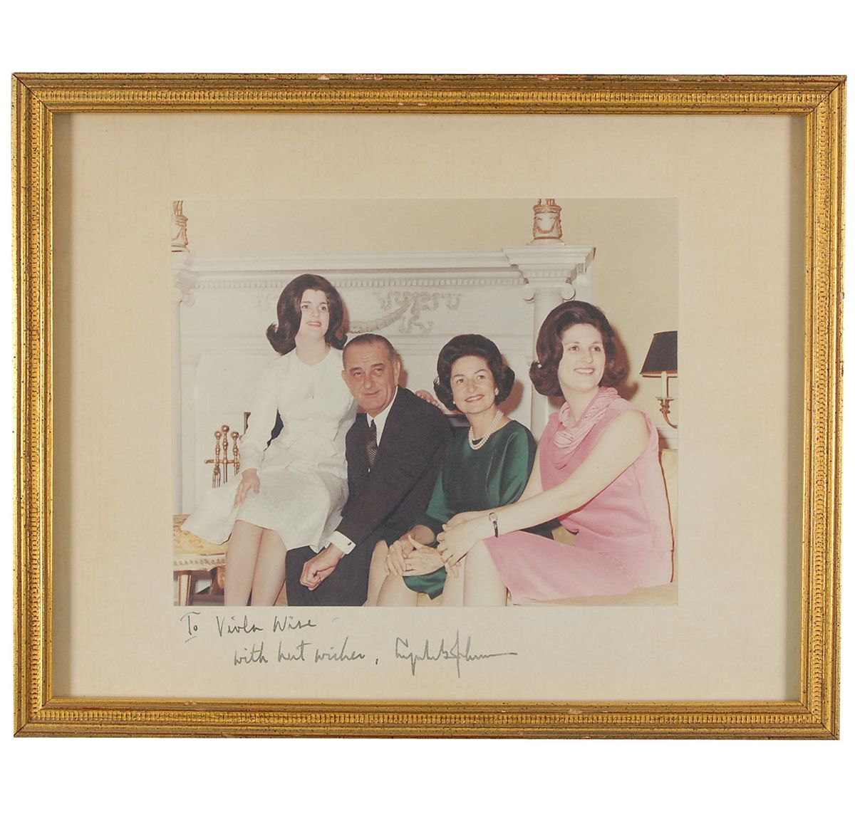 Color 9.25 x 7.5 photo of Lyndon and Lady Bird Johnson in the White House with their two daughters, affixed to a 13.75 x 11 mount, signed and inscribed on the mount in fountain pen, as president, to 30-year White House maid Viola ‘Big Momma’ Wise, “To Viola Wise—with best wishes, Lyndon B. Johnson.” Framed to an overall size of 15 x 12. In fine condition. ‘Big Momma’s huge personality was so beloved that the first families preferred to keep her close at hand.