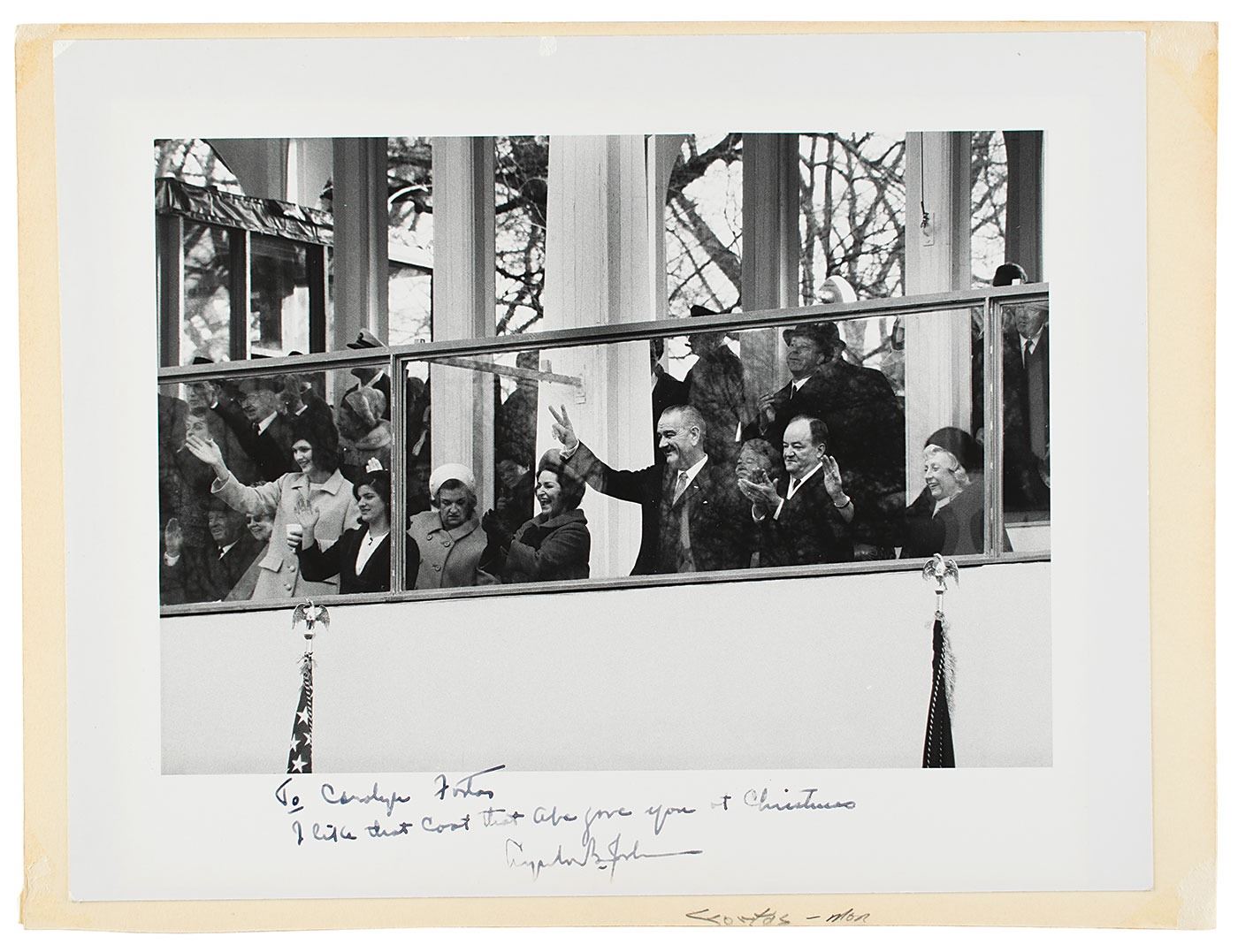 Glossy 14 x 11 silver gelatin photo of President Johnson watching the Inaugural Parade from the reviewing stand in front of the White House on January 20, 1965, signed and inscribed in fountain pen, "To Caroline Fortas, I like that coat that Abe gave you at Christmas, Lyndon B. Johnson.” Affixed to a slightly larger cardstock mount. In very good to fine condition, with two small areas of emulsion loss in the top border, and minor ink adhesion issues to the signature. Carolyn Fortas was the wife of lawyer and jurist Abe Fortas (1910–1982), whom Johnson nominated as an Associate Justice of the Supreme Court of the United States on October 4, 1965.